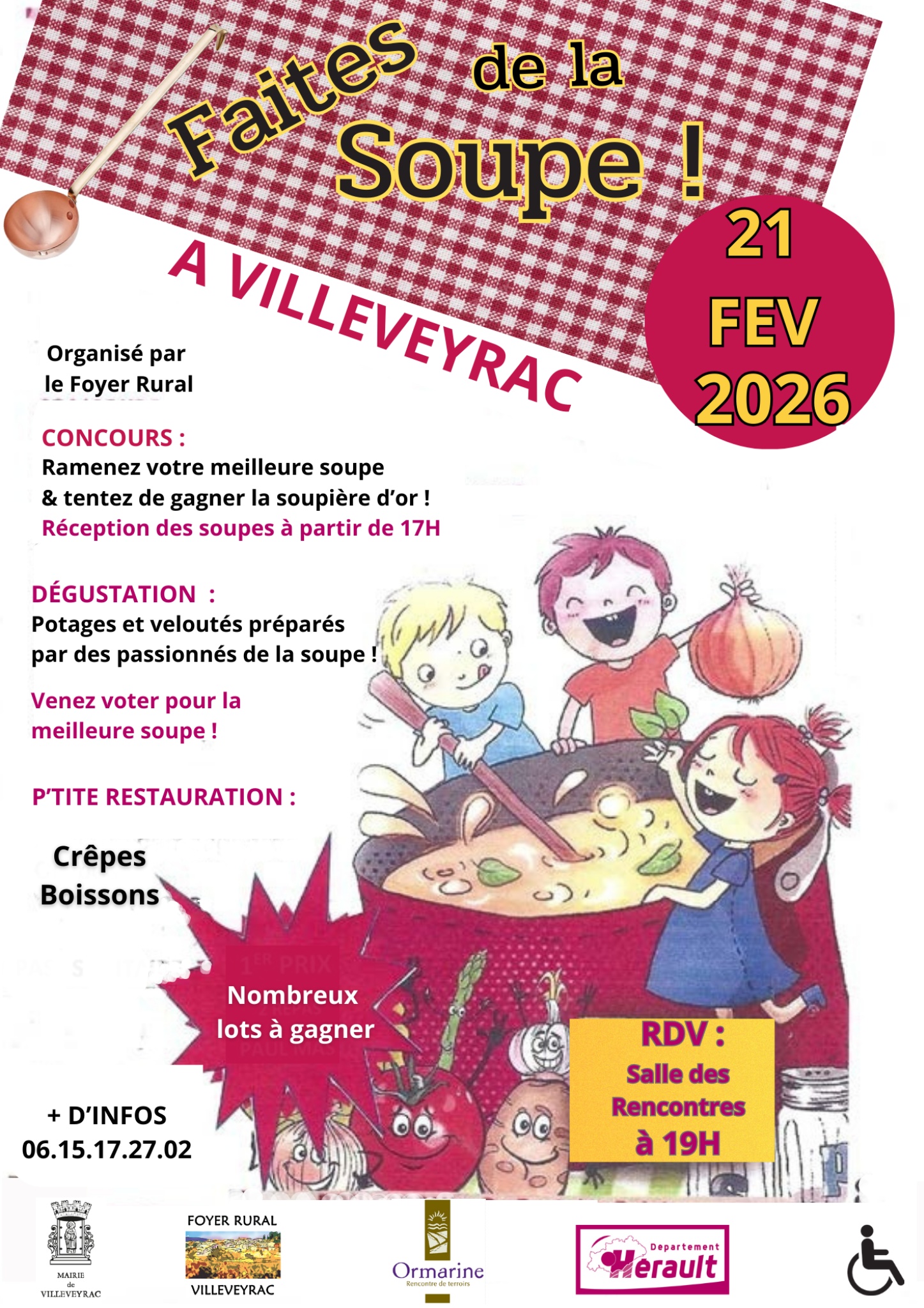 El Foyer Rural de Villeveyrac organiza una fiesta llamada “Faites de la soupe” (haz la sopa), un concurso abierto a todos, en el que puedes traer tu mejor sopa casera para tener la oportunidad de ganar la famosa “sopa de oro” Los gourmets están invitados a degustar las diferentes sopas y a votar por su favorita. Este acto se celebrará en la sala Marcel Peysson el 21 de febrero de 2026. De postre, habrá crepes y bebidas para completar esta agradable velada familiar.