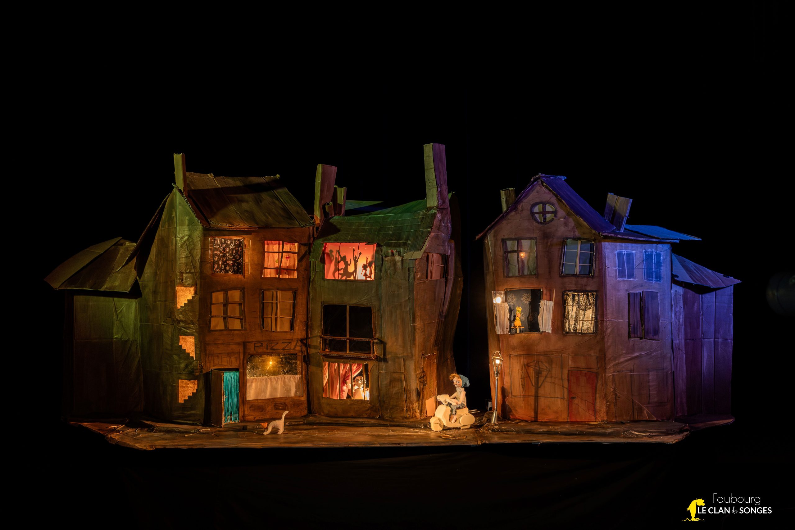 Sur scène, une maquette d’immeubles forme un quartier inspiré des films d’animation. Une personne ajuste les derniers détails : elle place un chat miniature sur un toit, fixe une ampoule à un lampadaire, puis s’en va en éteignant les lumières. Dès son départ, les appartements s’illuminent les uns après les autres et le quartier s’éveille. Derrière chaque fenêtre, la vie s’organise : les habitants reprennent le fil de leur soirée, chacun enfermé dans sa bulle. Mais une intrusion inattendue dans ce monde miniature provoque un mouvement collectif, rassemblant malgré eux les résidents de ce faubourg.