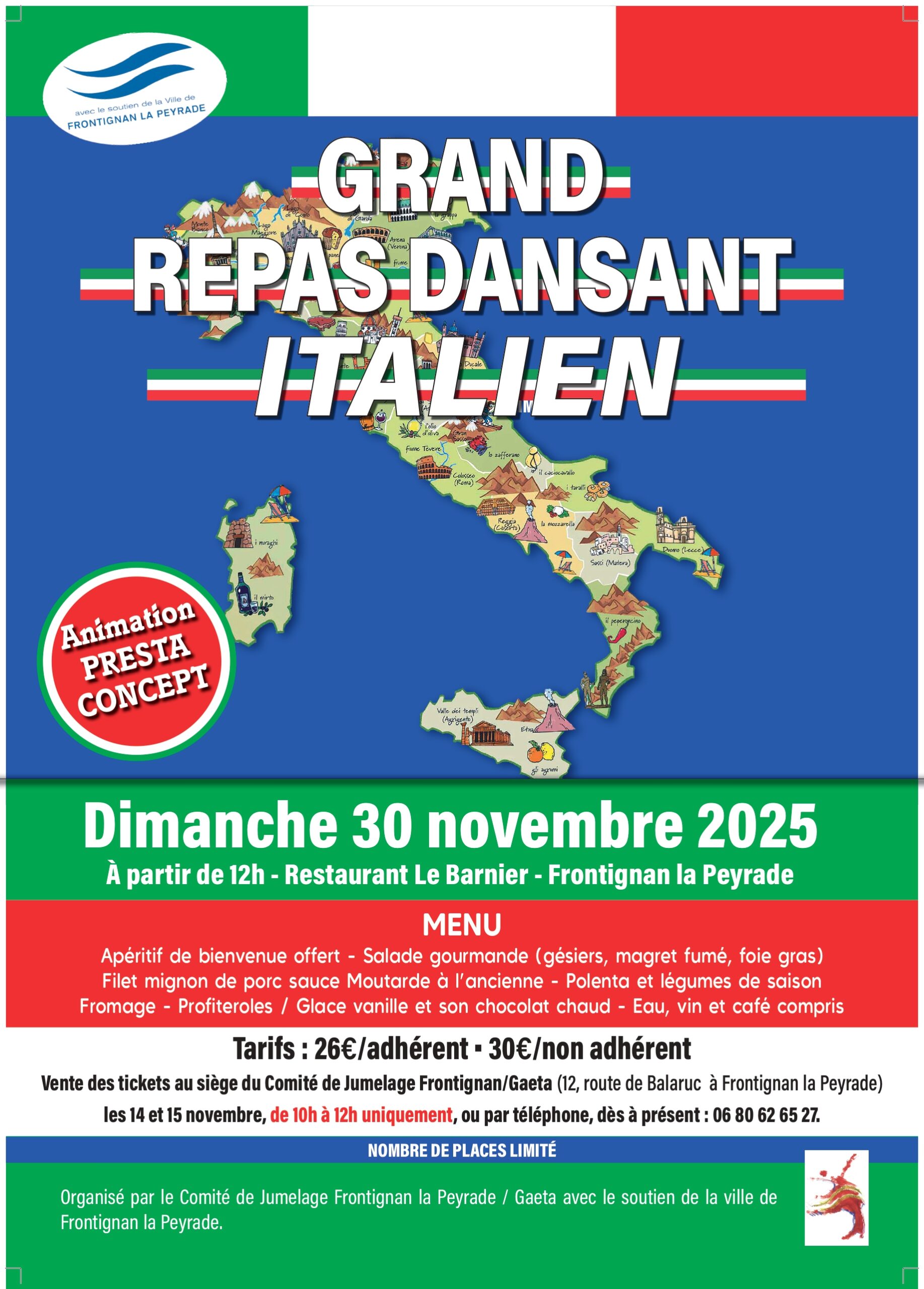 Organisé par le Comité de Jumelage Frontignan la Peyrade / Gaeta avec le soutien de la Ville de Frontignan la Peyrade.MENUApéritif de bienvenue offert – Salade gourmande (gésiers, magret fumé, foie gras)Filet mignon de porc sauce Moutarde à l’ancienne – Polenta et légumes de saisonFromage – Profiteroles / Glace vanille et son chocolat chaud – Eau, vin et café comprisAnimation musicale avec Presta ConceptNombre de places limité.Tarif : 26€/adhérent et 30€/non-adhérentVente des tickets au siège du Comité de Jumelage Frontignan/Gaeta (12, route de Balaruc à Frontignan la Peyrade) les 14 et 15 novembre, de 10h à 12h uniquement, ou par téléphone, dès à présent : 06 80 62 65 27.
