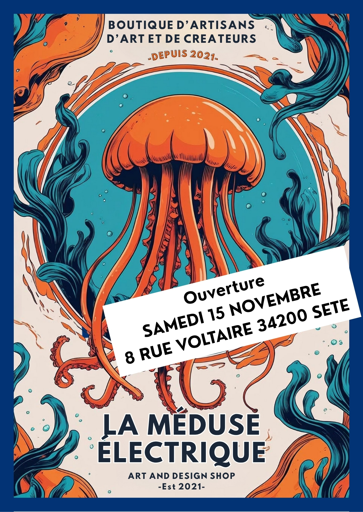 SURPRISE ! La Méduse Electrique traverse l’étang pour débarquer à Sète dans une boutique flambant neuve et vous invite à fêter ça !Ouverte à l’année, au cœur du quartier du théâtre, la Méduse Électrique garde la même recette qu’à Mèze : une boutique de créateurs par les créateurs.Pour ce premier cru, pas moins de 26 Artisans ont été sélectionnés pour la qualité de leur travail ainsi que leur savoir-faire :Acid Formik – Revue d’artAndorinhas – Savonnerie et parfums d’ambianceAtelier Caumeil – Joaillerie en métaux précieuxAtelier du Raïol – LuminairesCaroline Joyaux – Accessoires femmeCervannes – Pate de verreDH – Artiste plasticienDudit Maroquinerie – MaroquinerieFleur de Mamoot – Illustrations humoristiquesFinck – Luminaires vitrailGabriel Beghi Design – CéramiquesGwenaelle Georges – ReliureJoséphine – CéramiquesJolis momes – Habillement enfantJulia Gyse – CéramiquesL’adorée Créations – Bijoux en argile polymèreLaurence Sarnette – Sculpture en fils de ferLaura Samé – LinogravureMadame Bergamotte – Vêtements upcyclésMa machine et moi – ébénisterieMaLN – IllustrationsMehrake Ghodsi – IllustrationsMorue d’eau douce – Sacs banane et bagdesMoloko – Lingerie rock’n’rollPompon et Tricotin – Textiles et zéro déchetTīnctō – Teinture végétaleVernissage et rencontre des créateurs le 14 Novembre de 18 à 22h8 Rue Voltaire – 34200 SETEOuvert 7 jours /7 de 10h à 19h au mois de Décembredu Mardi au Samedi le reste du temps