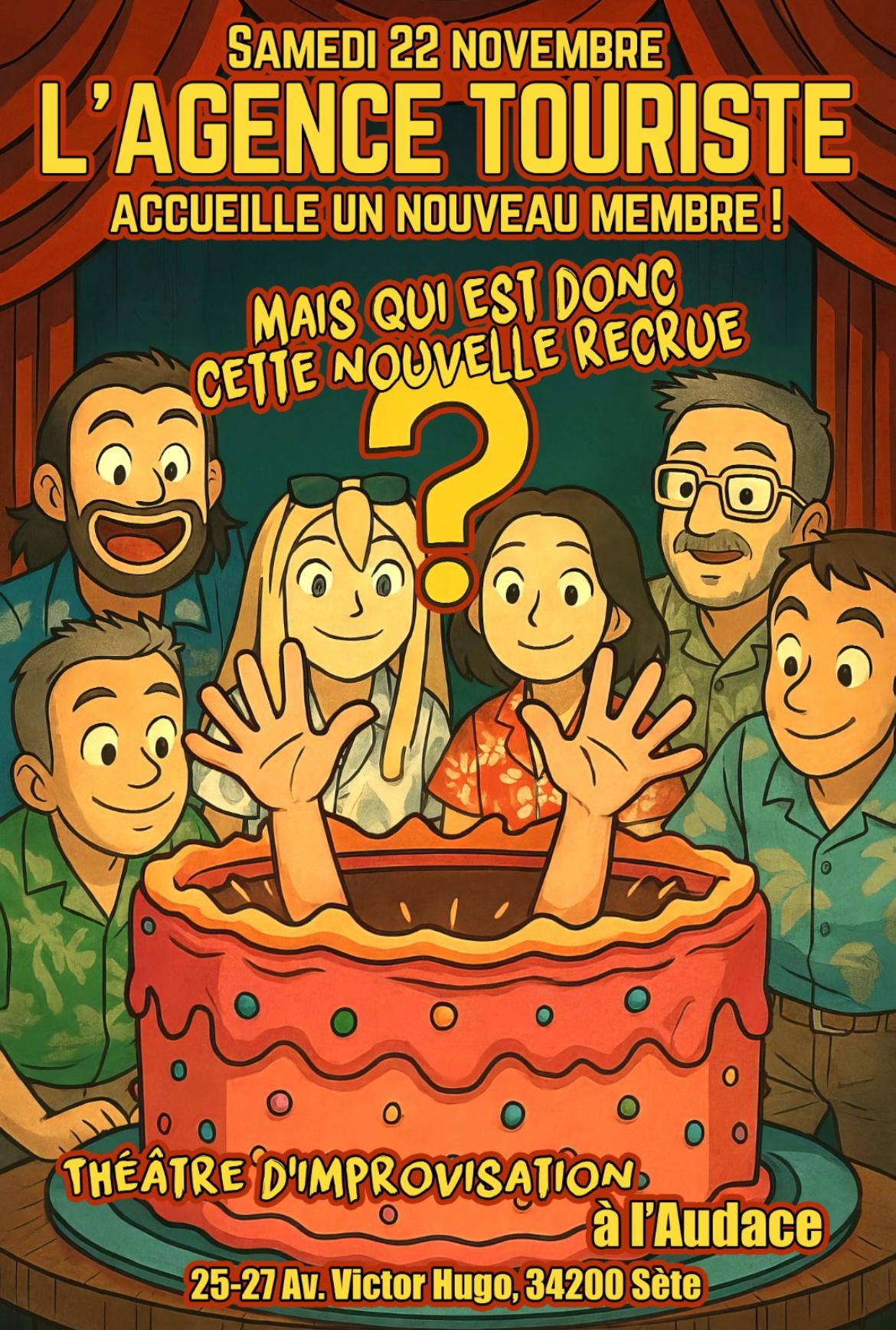 L’Agence Touriste revient à L’Audace !Et cette fois, la célèbre troupe d’improvisation réserve une surprise de taille…Le samedi 22 novembre, une nouvelle recrue rejoint l’équipe !Mais qui se cache derrière ce grand point d’interrogation ?Suspense, fous rires et situations improbables garantis pour cette soirée d’impro qui s’annonce explosive.De l’humour, de la spontanéité, une énergie folle et un véritable sens du collectif !Bienvenue dans l’univers complètement barré de L’Agence Touriste !Samedi 22 novembre – 20h30Bar & planches à partager sur placeRéservation conseillée