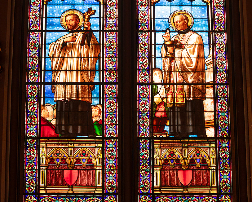 Capillas, pinturas, esculturas y vidrieras revelan las principales figuras de los santos jesuitas fundadores, como Ignacio de Loyola y Francisco Javier, en diálogo con santos locales, en particular Santa Germaine de Pibrac.