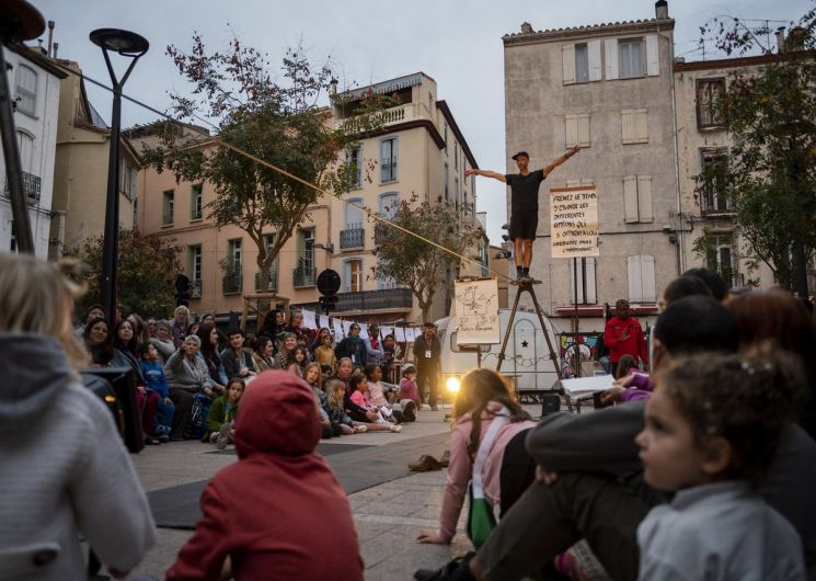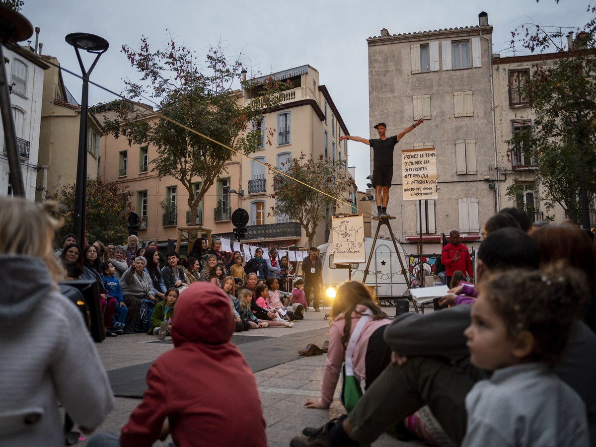 Sébastien Le Guen, funambule et dessinateur, s’installe en ville. Avec son fil de fer tendu entre deux arbres, il ne passe jamais inaperçu. Pendant deux jours, devant les curieux, l’homme s’entraîne plusieurs heures, puis consacre le reste de son temps à croquer ce qui se produit près de lui et ce qu’on lui dit. De ces rencontres, Sébastien dresse plusieurs portraits qu’il accroche progressivement autour de sa caravane. Et bientôt, comme dans une exposition, ses esquisses envahissent l’espace public.