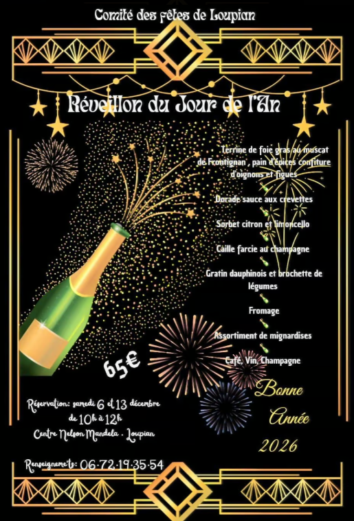 Une soirée d’exception pour bien commencer 2026 !Le Comité des Fêtes de Loupian vous invite à vivre un Réveillon du Nouvel An 2025-2026 inoubliable !Rendez-vous à la Salle Nelson Mandela pour une soirée placée sous le signe de la fête, de la gastronomie et de la convivialité.Préparez-vous à dire adieu à 2025 et à accueillir 2026 dans une ambiance chic et festive, autour d’un repas gourmand et d’une soirée animée qui promet de rester gravée dans les mémoires des Loupianais !Un menu raffiné pour un réveillon d’exceptionÀ l’occasion du Réveillon du Jour de l’An, le Comité des fêtes de Loupian a concocté un menu gastronomique digne des plus belles tables.Menu du Réveillon Nouvel An 2025-2026 :Terrine de foie gras au muscat de Frontignan, pain d’épices, confiture d’oignons et figuesDorade sauce aux crevettesSorbet citron et limoncelloCaille farcie au champagneGratin dauphinois et brochette de légumesFromageAssortiment de mignardisesCafé, vin et champagne inclusTarif : 65 € par personneInscriptions :Réservations les samedis 6 et 13 décembre de 10h à 12h au Centre Nelson MandelaRenseignements : 06 72 19 35 54Une soirée où gastronomie et bonne humeur seront les ingrédients phares pour fêter la nouvelle année comme il se doit !Une soirée festive organisée avec soinLe Réveillon Nouvel An 2025-2026 à Loupian est avant tout un moment de partage, organisé par le Comité des fêtes de Loupian, reconnu pour son savoir-faire et sa passion des grands événements populaires.Ambiance conviviale, décor scintillant et champagne à volonté pour trinquer à 2026 — tout est prévu pour une nuit magique sous les étoiles du bassin de Thau.
