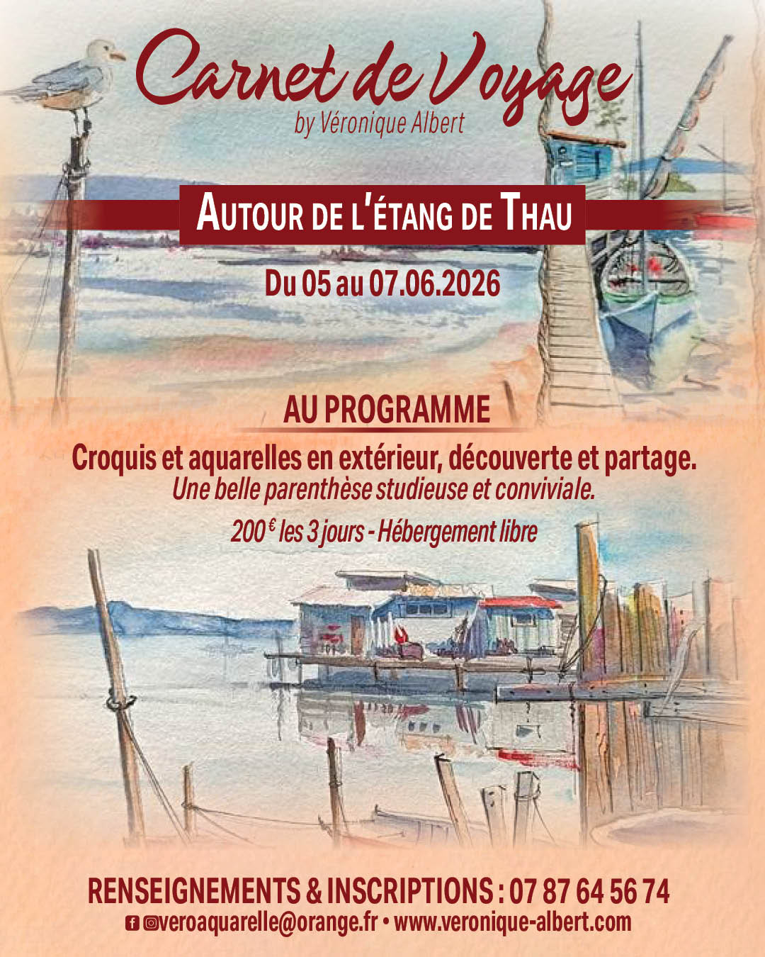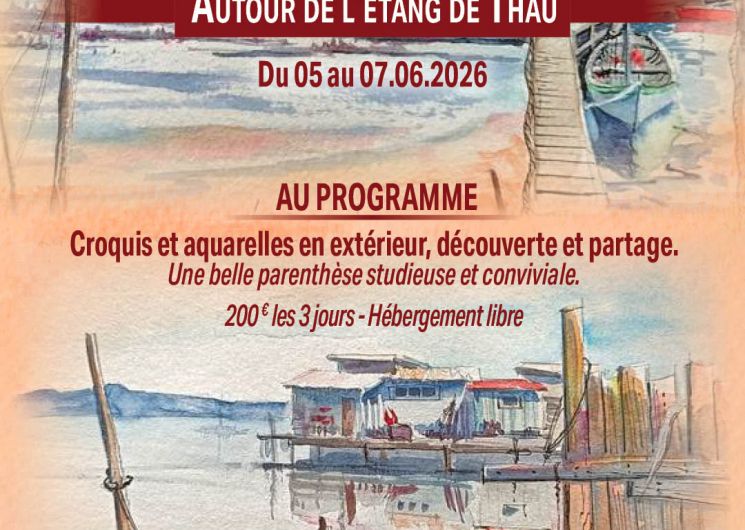 Stage carnet de voyage du 5 au 7 juin 2026, une parenthèse colorées et au grand air, autour de l’étang de Thau.Vous apprendrez à observer, simplifier votre dessin, poser un peu de couleur, composé les pages de votre carnet de voyage en mélangeant peinture et collage.Pour toutes informations et programme complet, contact : veroaquarelle@orange.fr 07 87 64 56 74