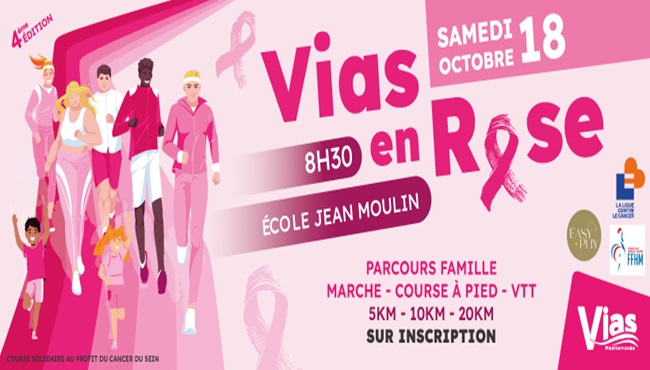 Samedi 18 octobre, dès 8h30, le service des sports de la ville organise la quatrième édition de « Vias en rose », un événement sportif dédié à la lutte contre le cancer du sein qui se déroulera au sein de la cour de l’École Jean Moulin et proposera un programme complet pour toute la famille.