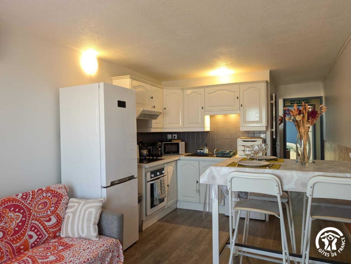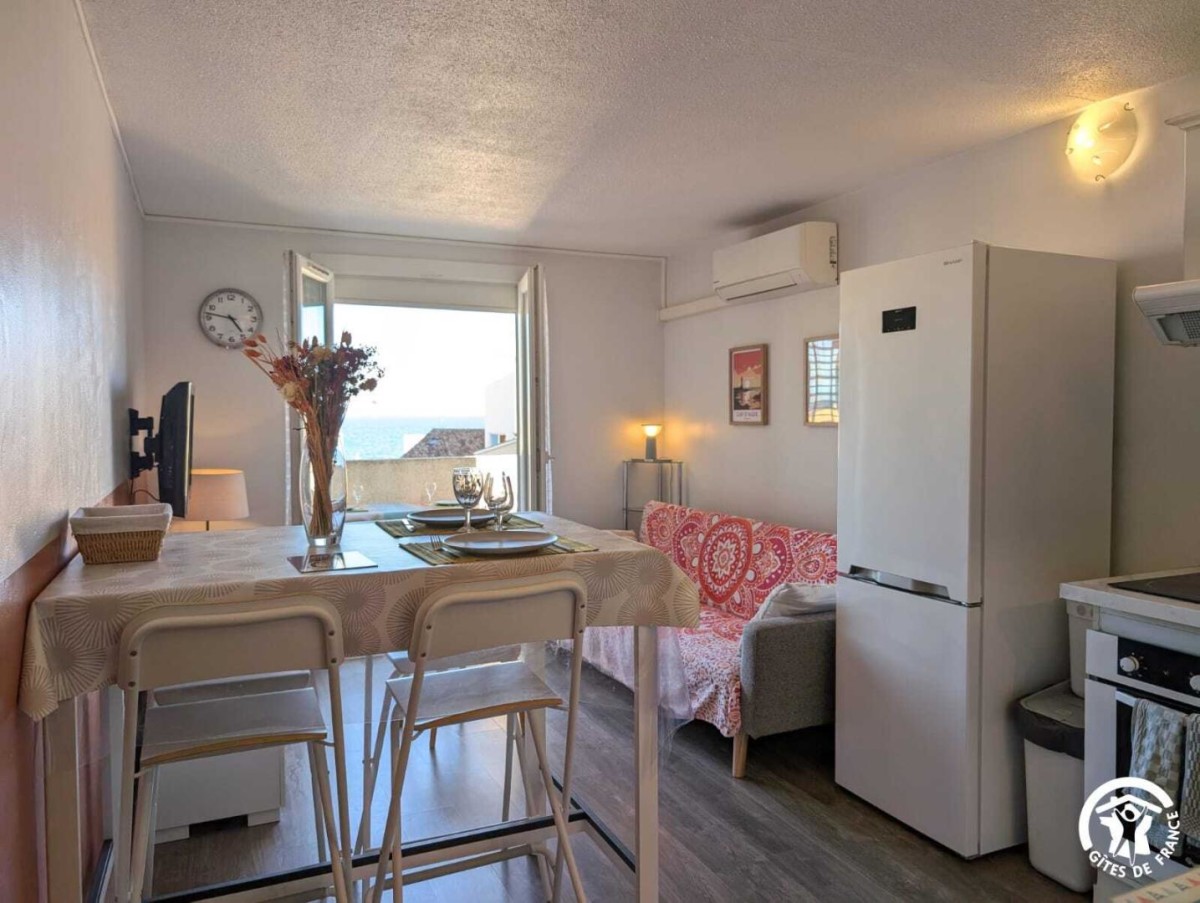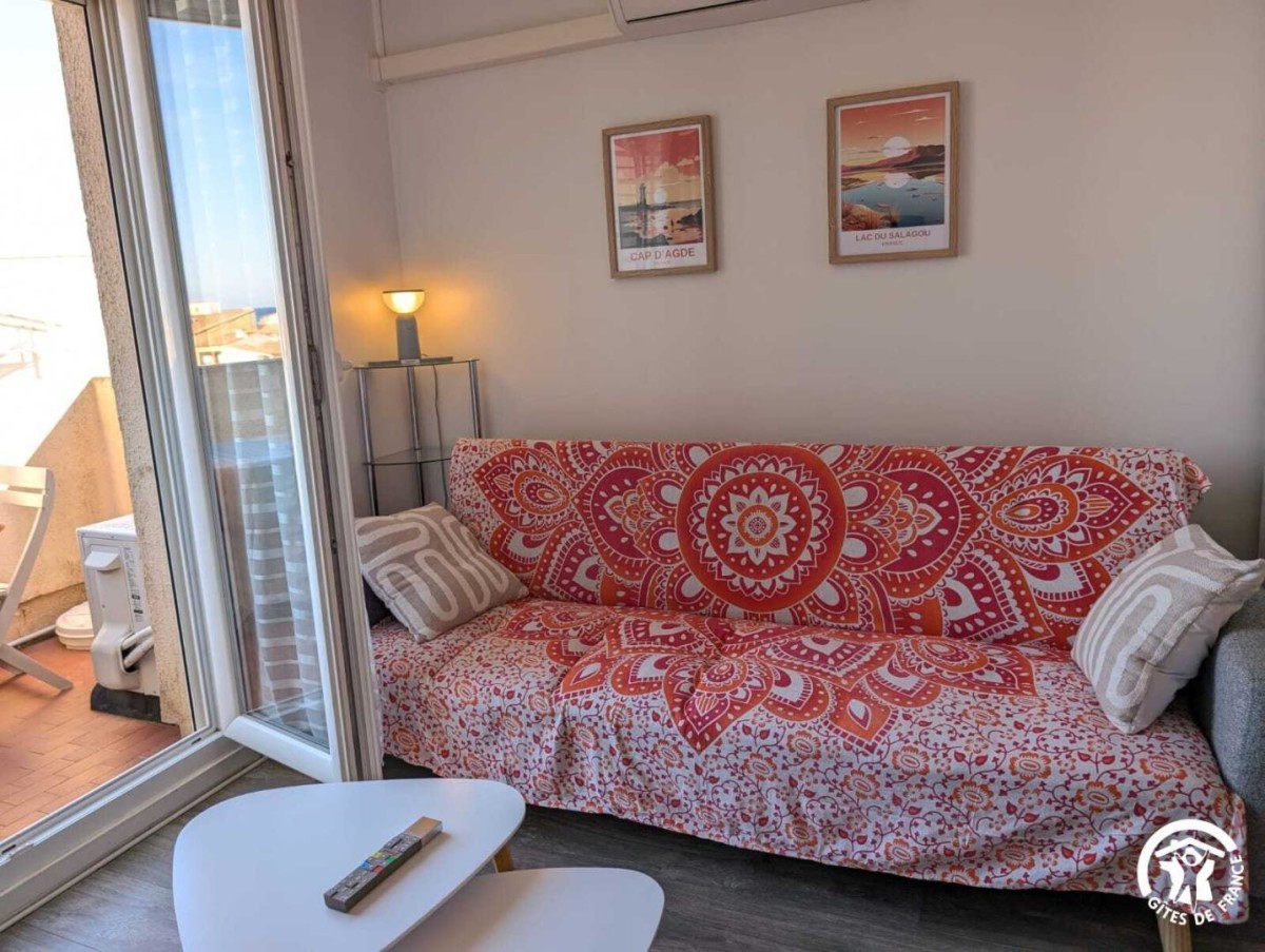 Situé dans l’effervescente station balnéaire du Cap d’Agde, cet appartement est idéal pour découvrir les charmes du littoral héraultais. À proximité immédiate, l’allée de la Flânerie, très animée en été, vous plonge dans l’ambiance festive du bord de mer, avec ses boutiques, ses restaurants et ses marchés nocturnes. Vous pourrez également découvrir Agde, ville d’art et d’histoire, visiter le musée de l’Éphèbe, ou profiter des plages de sable fin, du port de plaisance et des nombreuses activités nautiques. Situé au 4e étage d’une résidence en ville, dans une rue piétonne très animée, ce City break traversant pour deux personnes offre une ambiance traditionnelle et un cadre bord de mer. L’appartement se compose d’une cuisine ouverte entièrement équipée (lave-linge, four, micro-ondes, frigo, congélateur, bouilloire, grille-pain, plaque de cuisson, cafetière Tassimo et filtre), d’un espace salle à manger avec table haute, chaises, canapé et télévision, et d’une salle d’eau avec douche, vasque et WC (sèche-cheveux). La chambre, également située au 4e étage, dispose d’un lit double 140×190, d’un ventilateur plafonnier et d’une superficie de 10,5 m². À l’extérieur, un balcon ombragé permet de profiter des douces soirées estivales. Le stationnement se fait sur les parkings publics à proximité (300m). L’appartement est équipé de la climatisation dans le salon pour plus de confort en été. Le ménage et le linge sont proposés en option. 1 couchage d’appoint est disponible pour un enfant sur demande auprès du service réservation (0468114070). Points forts : Emplacement central au Cap d’Agde Vue mer Climatisation Accès direct aux plages, au port et aux commerces Idéal pour un séjour en couple