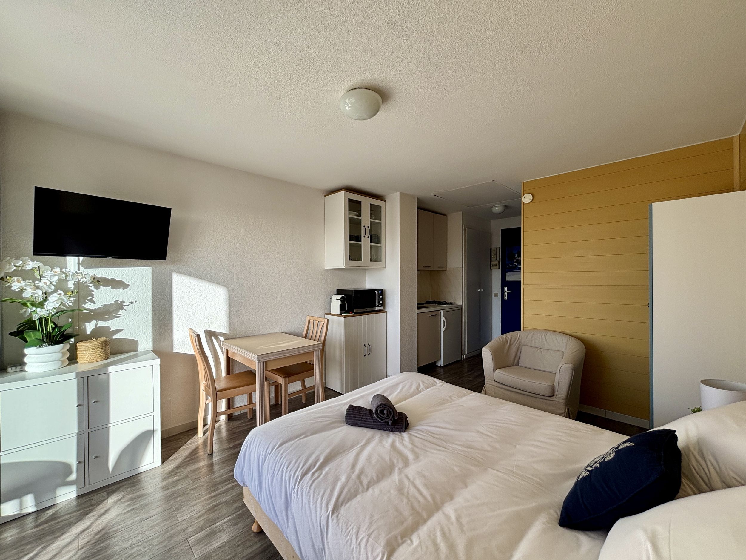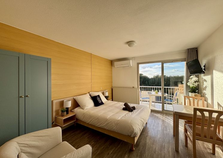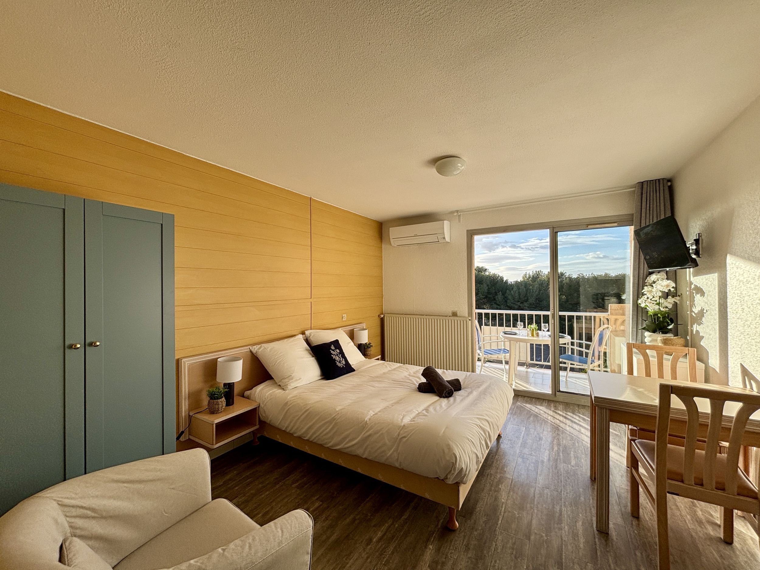 Venez buller à la Bulle de Thau, un studio cosy pour 2 personnes avec accès piscine. Terrasse exposée sud-ouest avec vue sur la piscine, le village et la pinède, l’endroit parfait pour admirer de magnifiques couchers de soleil. Esprit vacances assuré dans cette résidence de tourisme avec piscine et transats en libre accès de mai à octobre. Espace nuit confortable avec lit double et grands placards. Climatisation pour des nuits fraîches et agréables. Cuisine entièrement équipée (frigo, four micro-ondes, cafetière Nespresso…) avec tout le nécessaire pour cuisiner comme à la maison. Salle de bain avec baignoire, WC et rangements. Draps et serviettes fournis pour un séjour léger et sans stress. Produits de base disponibles à l’arrivée : savon, papier toilette, café, thé, sel, huile… Parking privé dans la résidence et local à vélos. Laverie dans la résidence (service payant). Envie de soleil, de thermalisme et de détente ? Bienvenue à la Bulle de Thau, votre parenthèse méditerranéenne