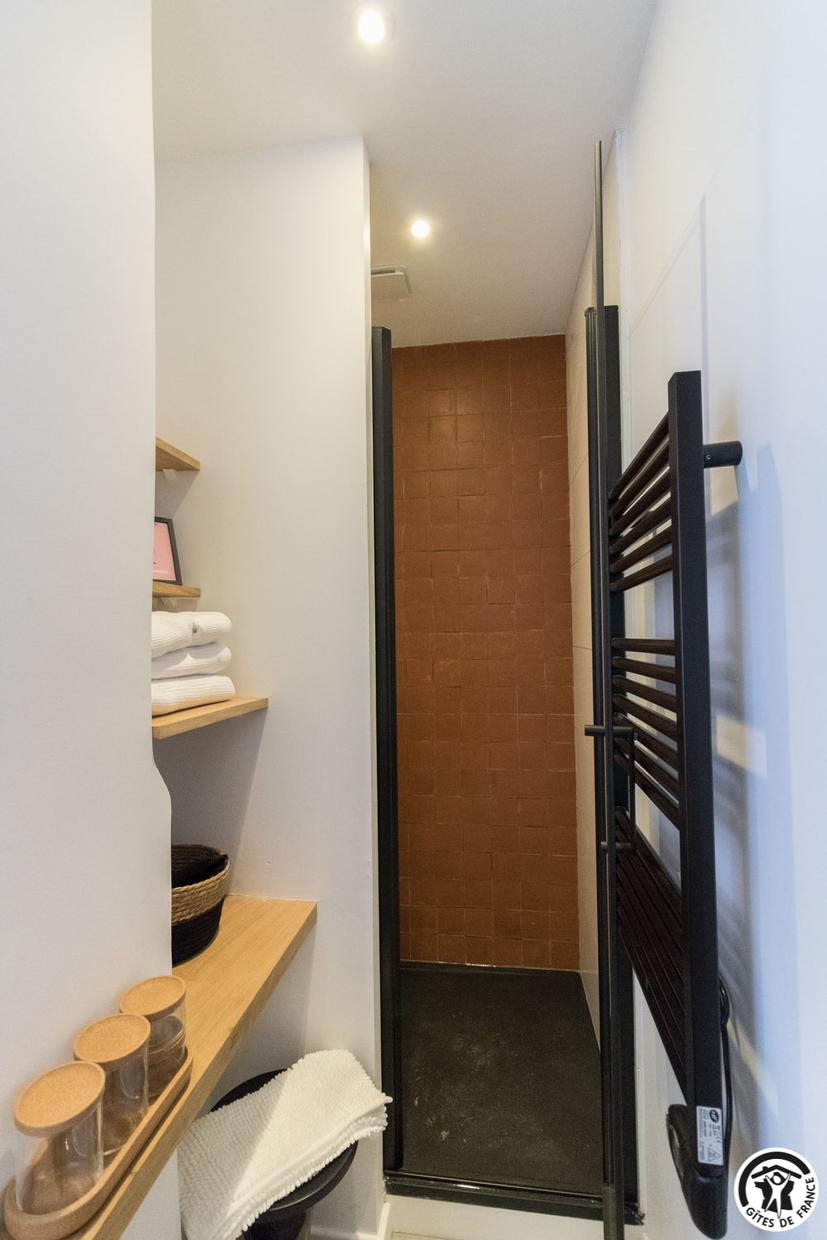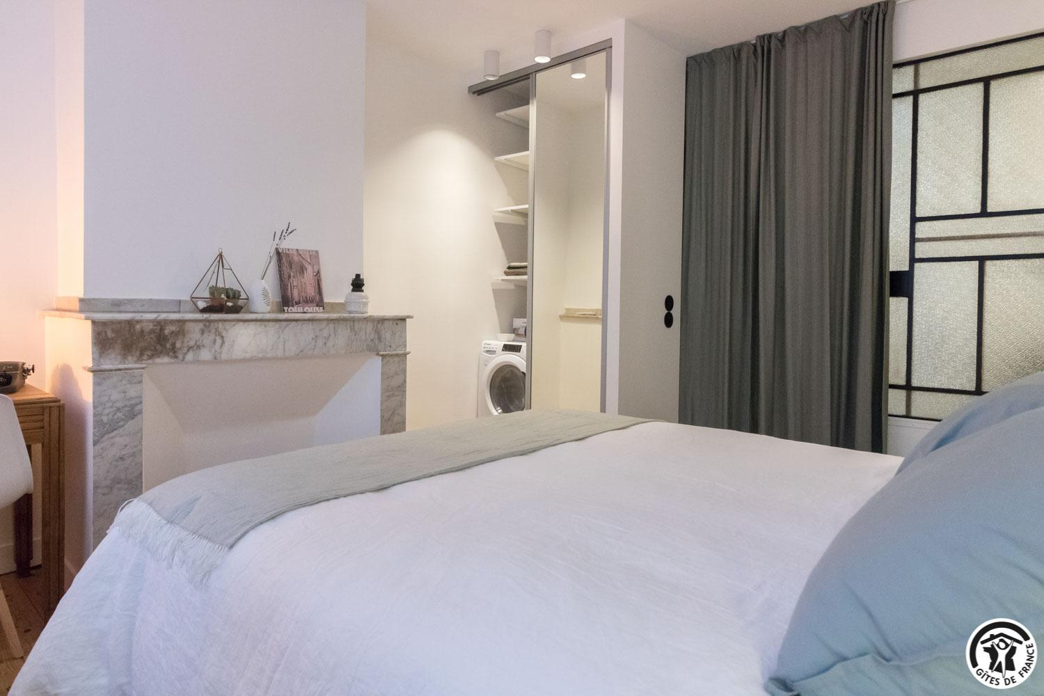 Estudio con fachada protegida de Toulouse: entrada, sala de estar con cocina integrada y muy bien equipada, zona de comedor y zona de estar (Smart TV de pantalla plana con Netflix y Molotov), cuarto de ducha (pared de terracota natural que recuerda al ladrillo de Toulouse), zona de dormitorio separada por una cortina y un techo de cristal (1 cama doble de 160*200cm). Plaza de aparcamiento privada a 10m.