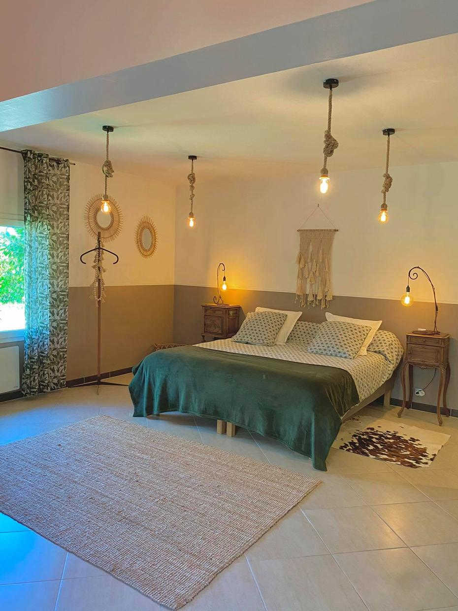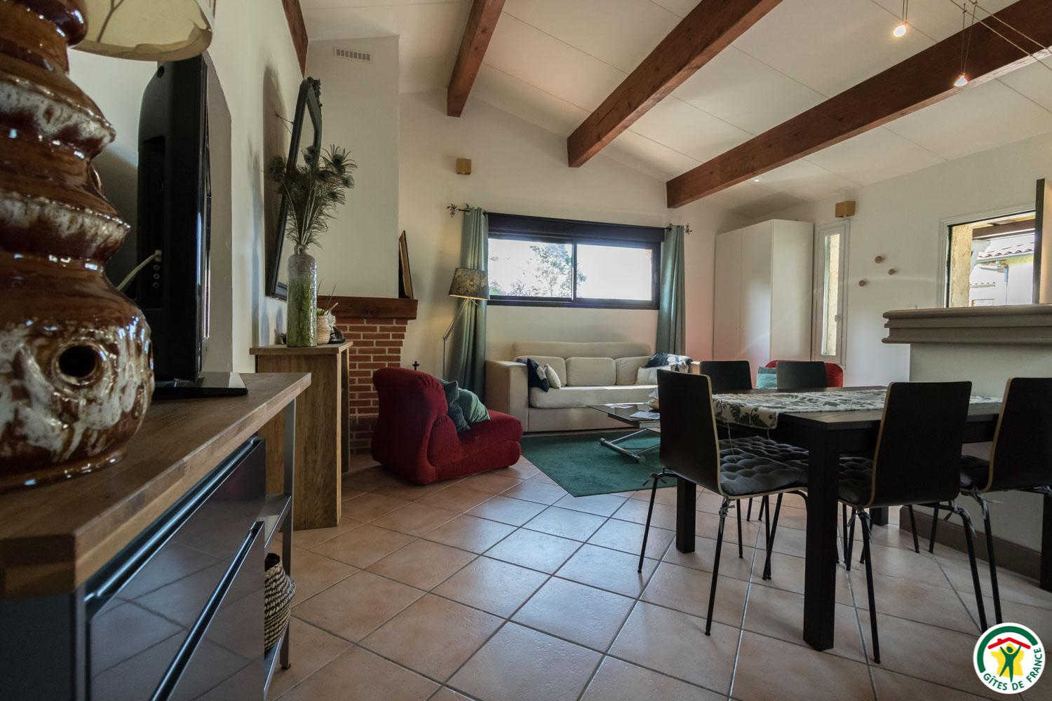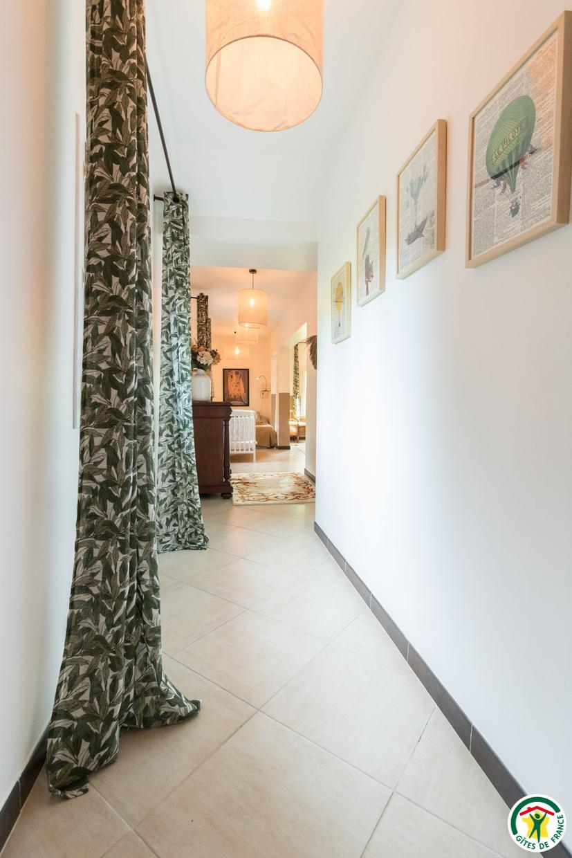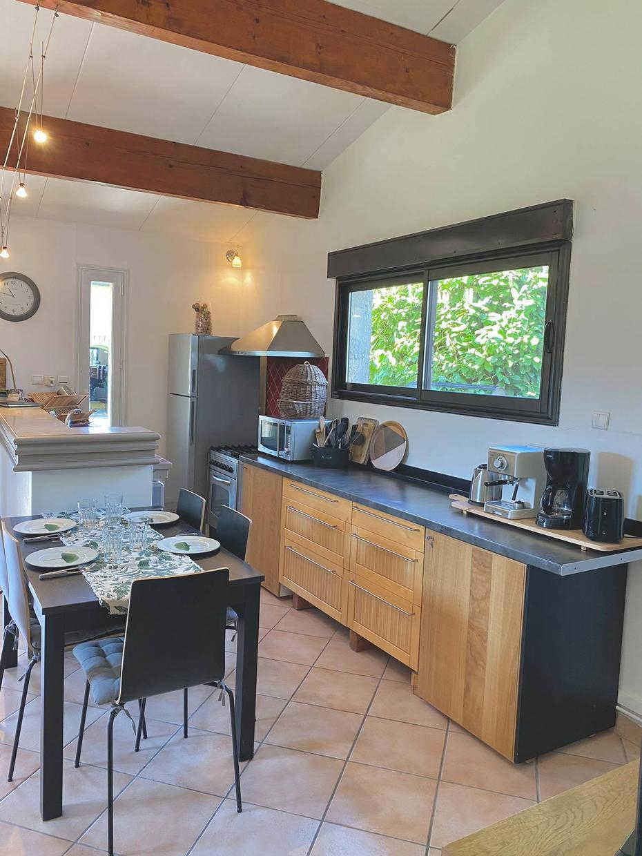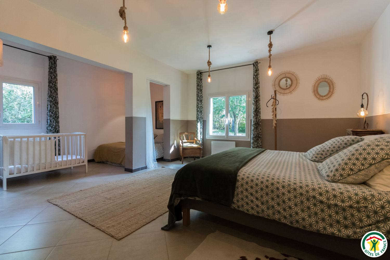 Casa rural de una sola planta: salón con cocina americana, 2 habitaciones, una de ellas de 38 m2 (1 cama doble de 140 cm) (1 cama doble de 180×200 convertible en 2×90 + 1 cama doble de 140 cm), cada una con cuarto de baño con ducha, WC. Para los niños: DVD, juegos de mesa, libros. Exterior: terraza privada, aparcamiento. Gran jardín. Piscina compartida con los propietarios.