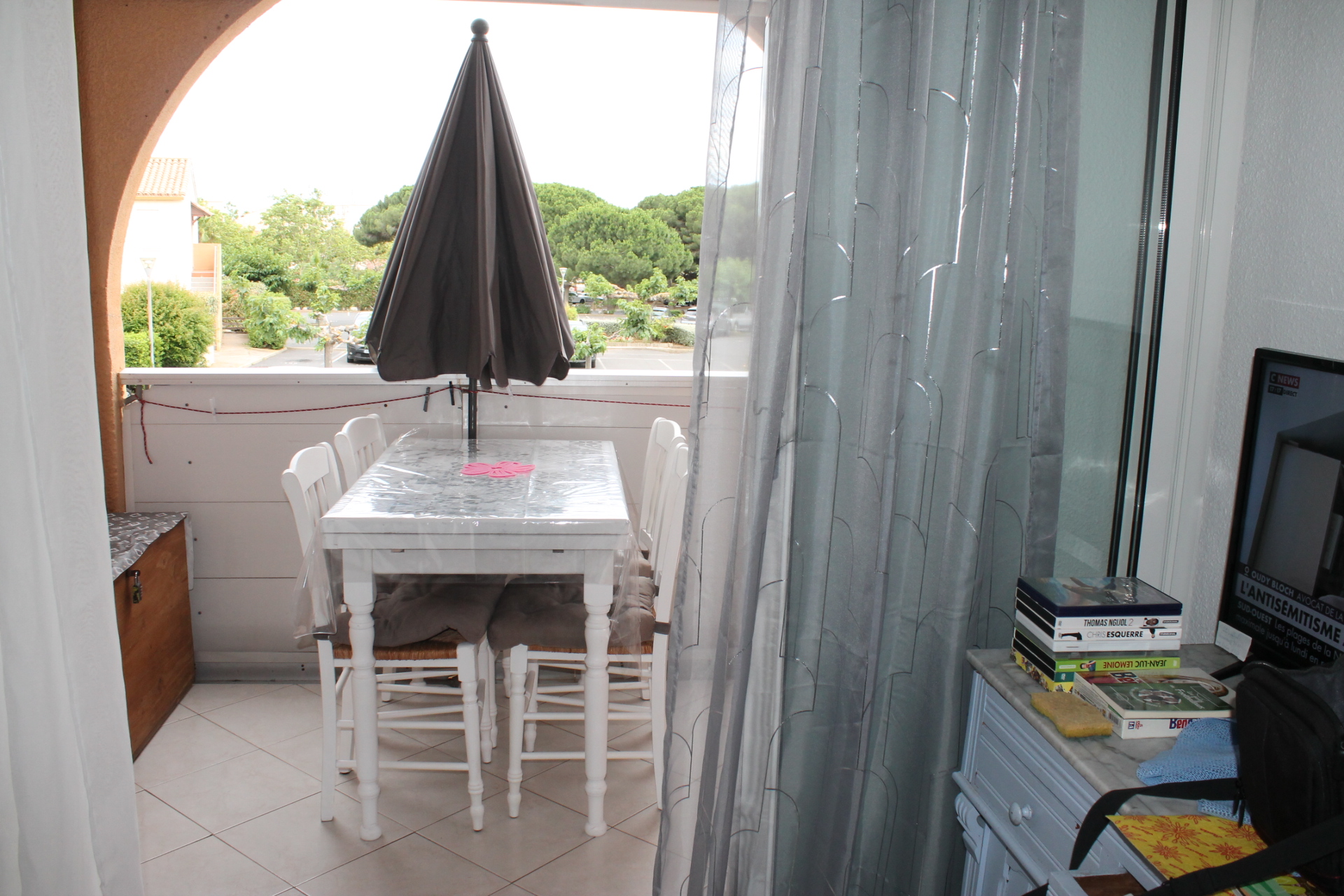 Pièce principale avec clic-clac (140×190), cuisine équipée, TV, l balcon sans vis à vis. Climatisation réversible
