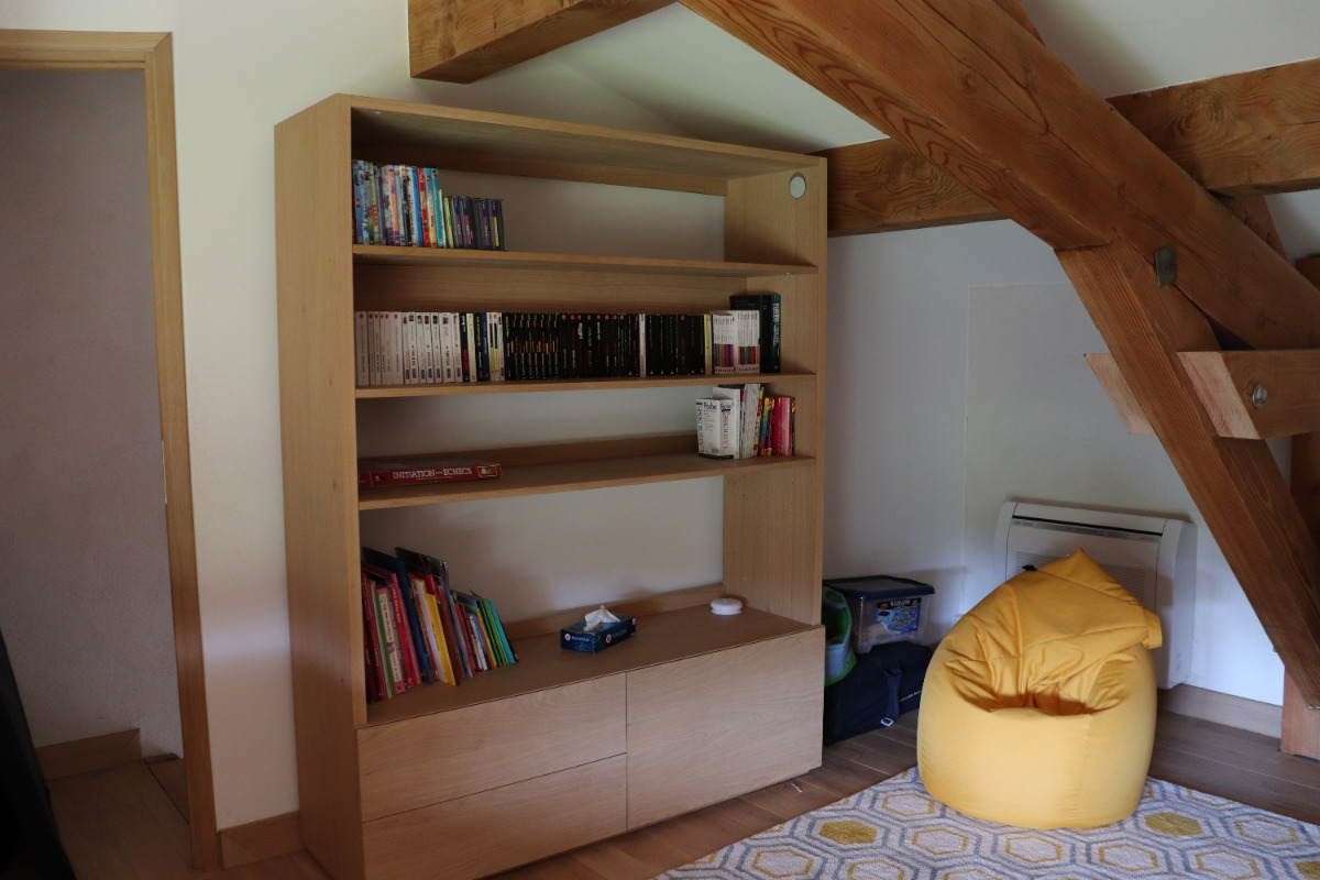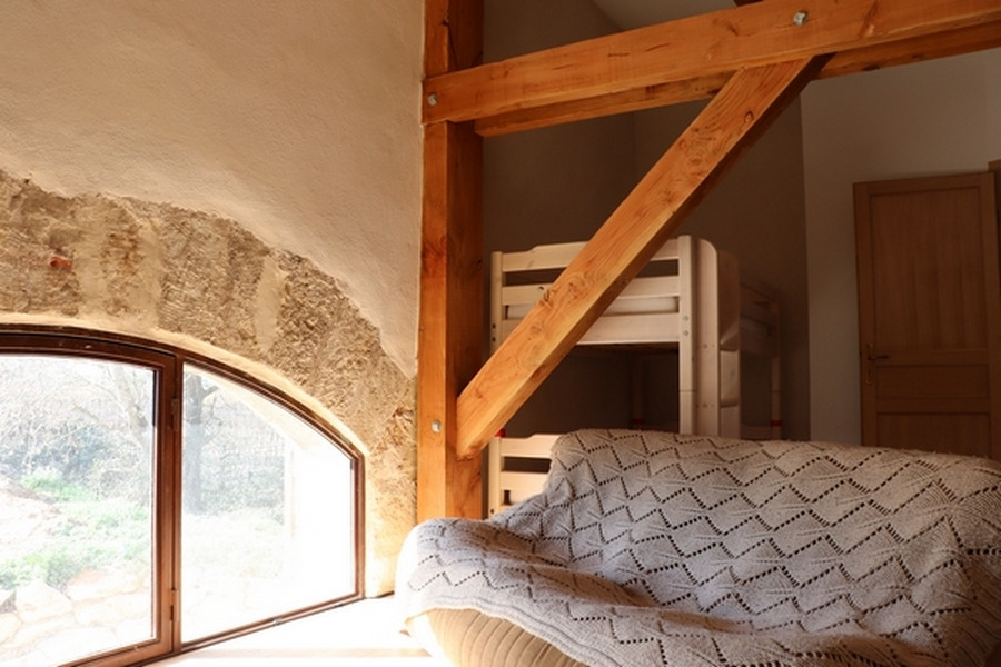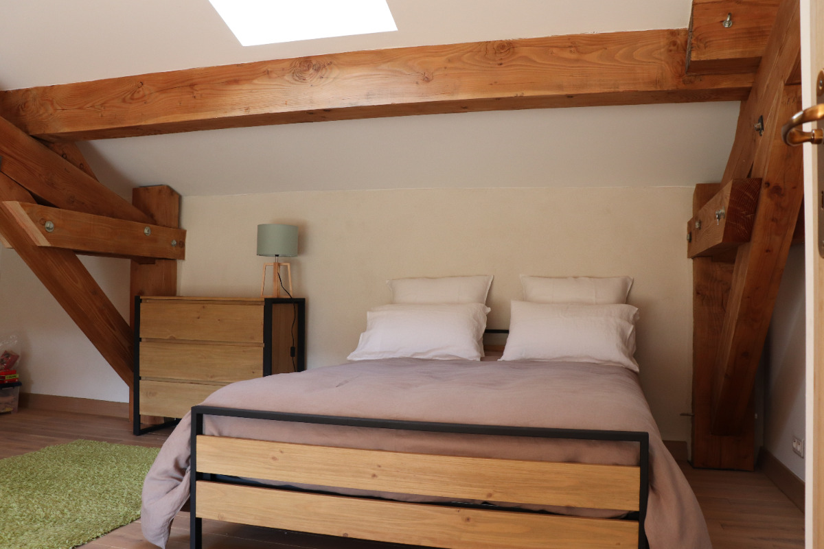 À l’étage, vous trouverez une chambre indépendante avec un lit double (140×190) ainsi qu’un grand dortoir comprenant un lit double (140×190) et deux lits superposés (90×190). Pour votre confort, un coin télévision et une salle d’eau avec WC et douche sont également à votre disposition.