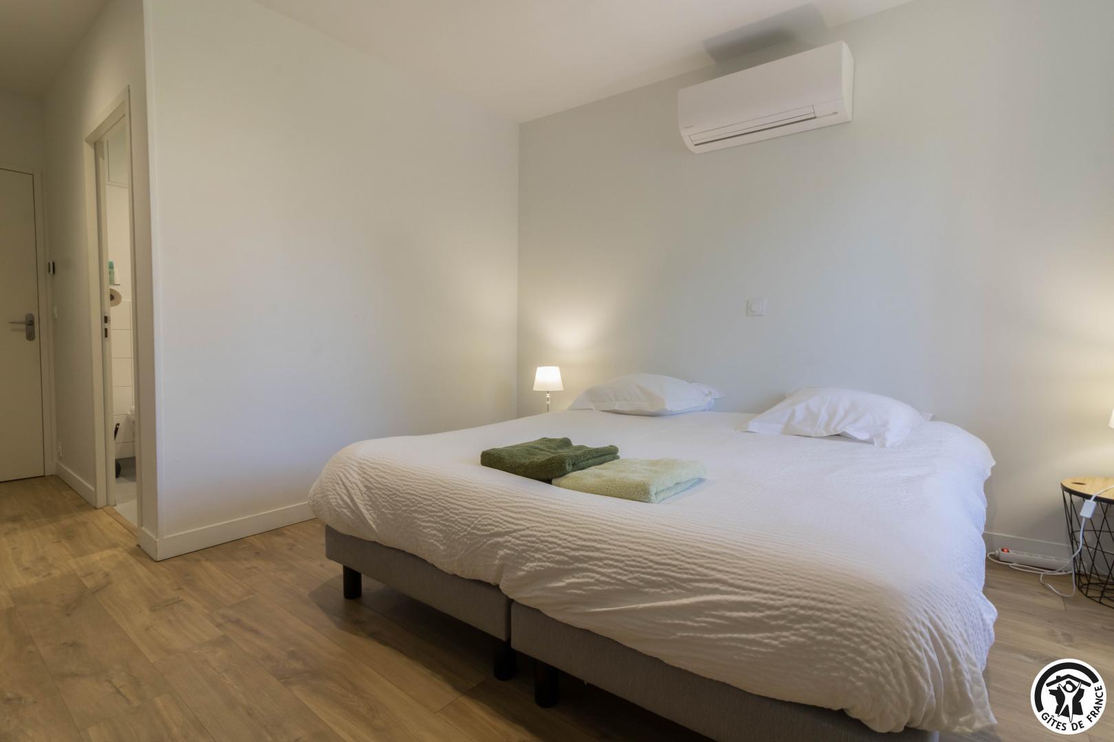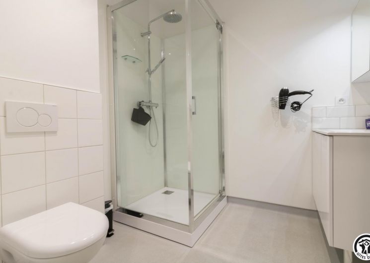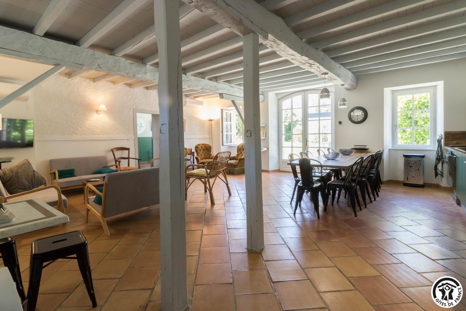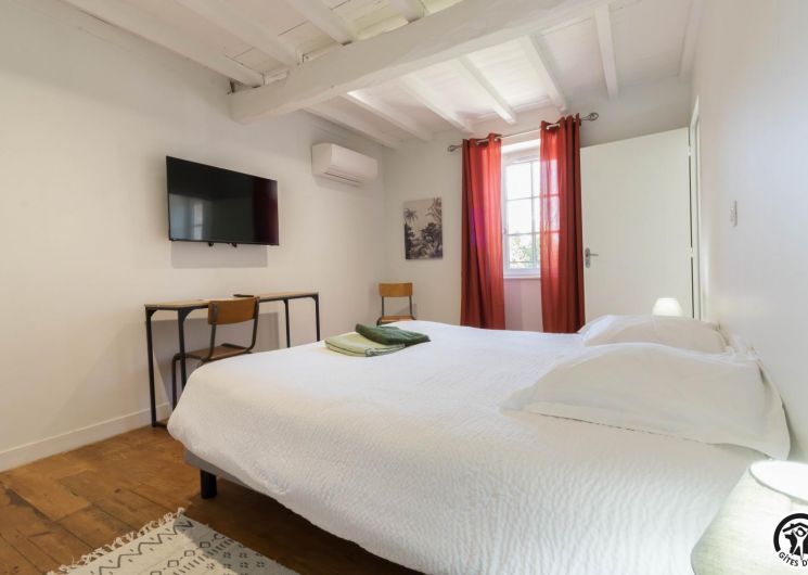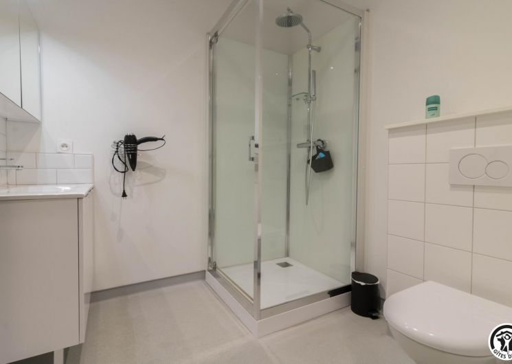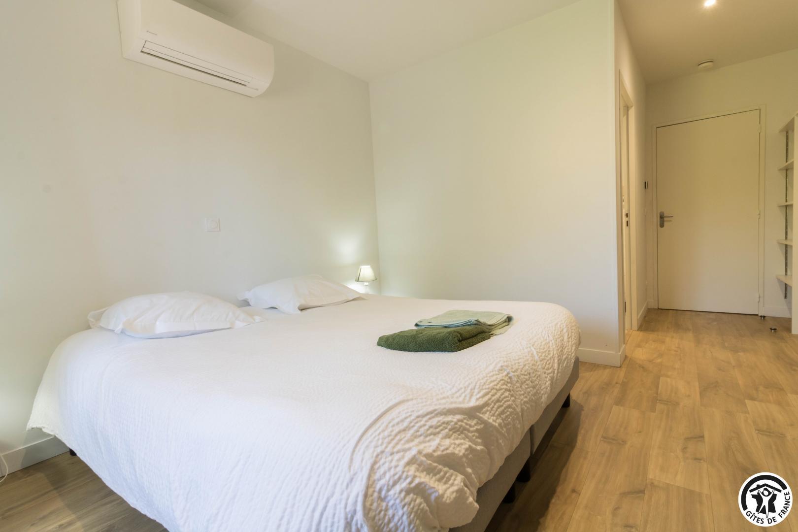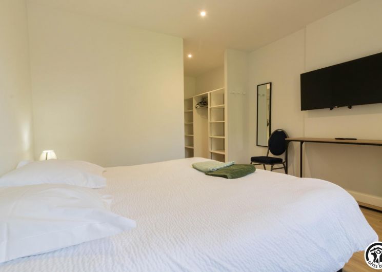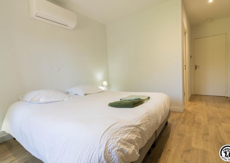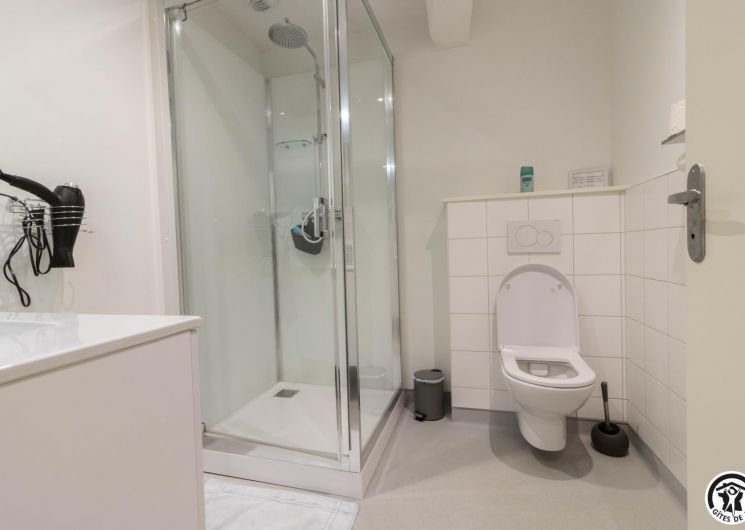 Planta baja: entrada, gran salón con cocina americana, comedor y sala de estar. Dormitorio y cuarto de ducha/WC accesible para minusválidos, WC separado. Planta superior: un pasillo conduce a otros 5 dormitorios, cada uno con su propio cuarto de ducha/WC. Cada habitación tiene 2 camas individuales de 90 cm, TV, acceso a Internet, escritorio y aire acondicionado.