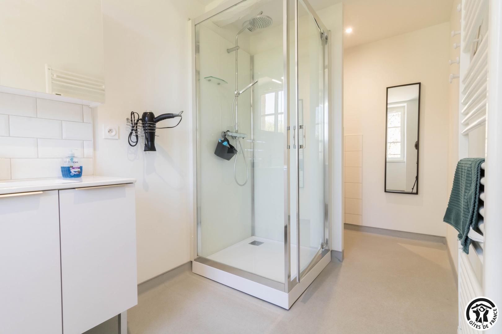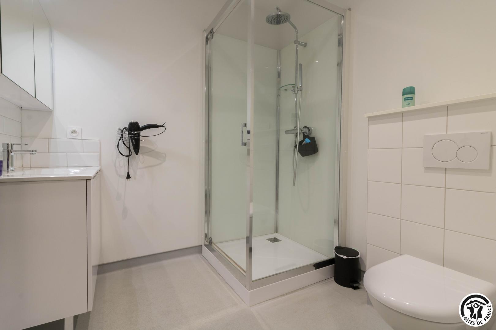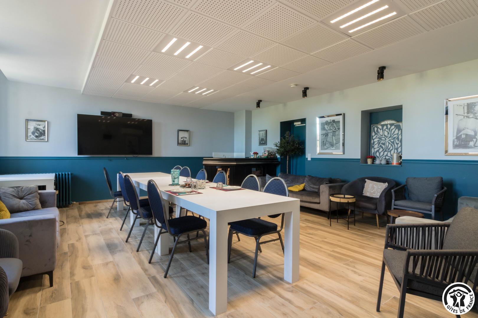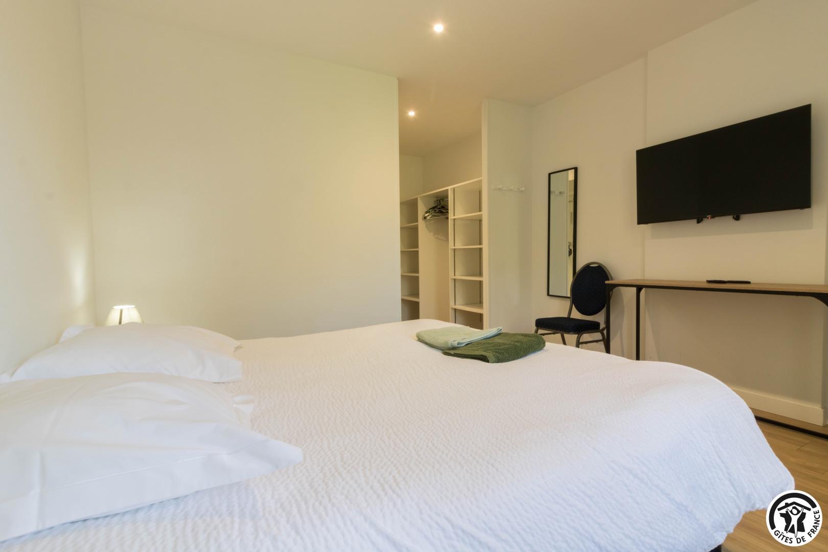 Planta baja: entrada, gran salón con cocina americana, comedor y sala de estar. Dormitorio y cuarto de ducha/WC accesible para minusválidos, WC separado. Planta superior: un pasillo conduce a otros 5 dormitorios, cada uno con su propio cuarto de ducha/WC. Cada habitación tiene 2 camas individuales de 90 cm, TV, acceso a Internet, escritorio y aire acondicionado.