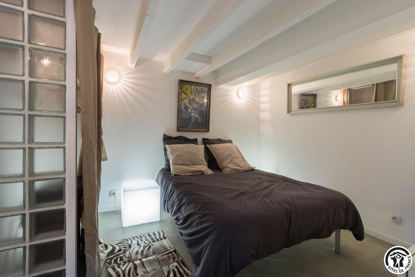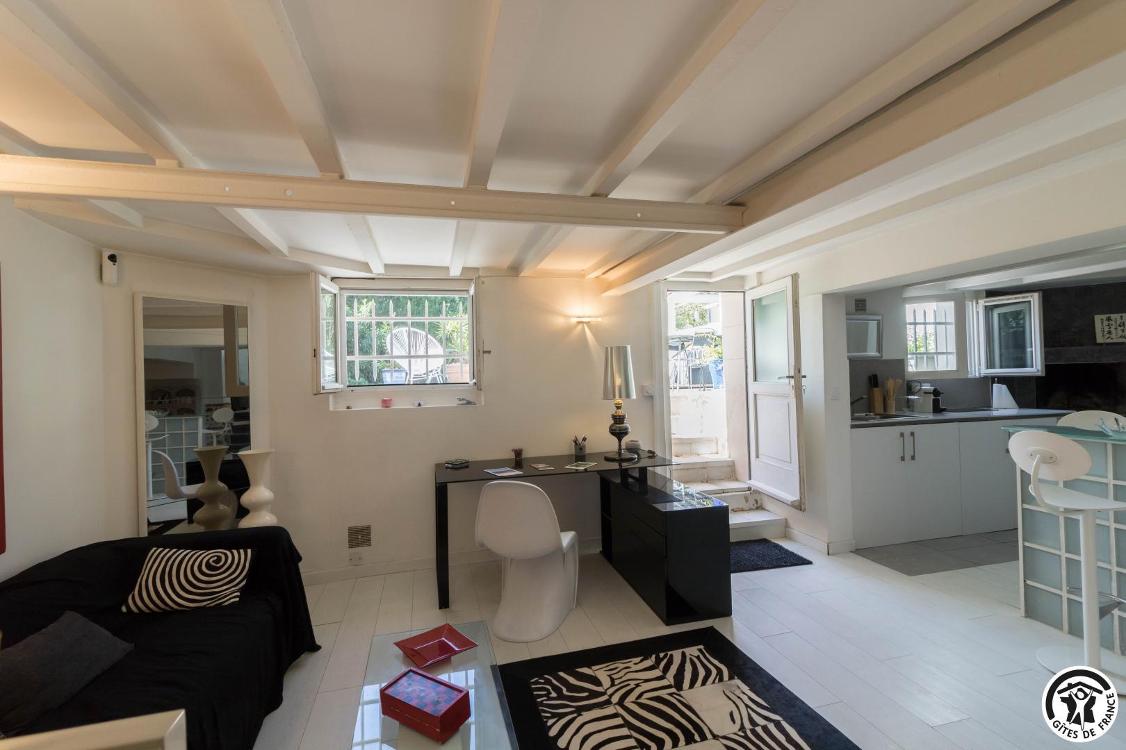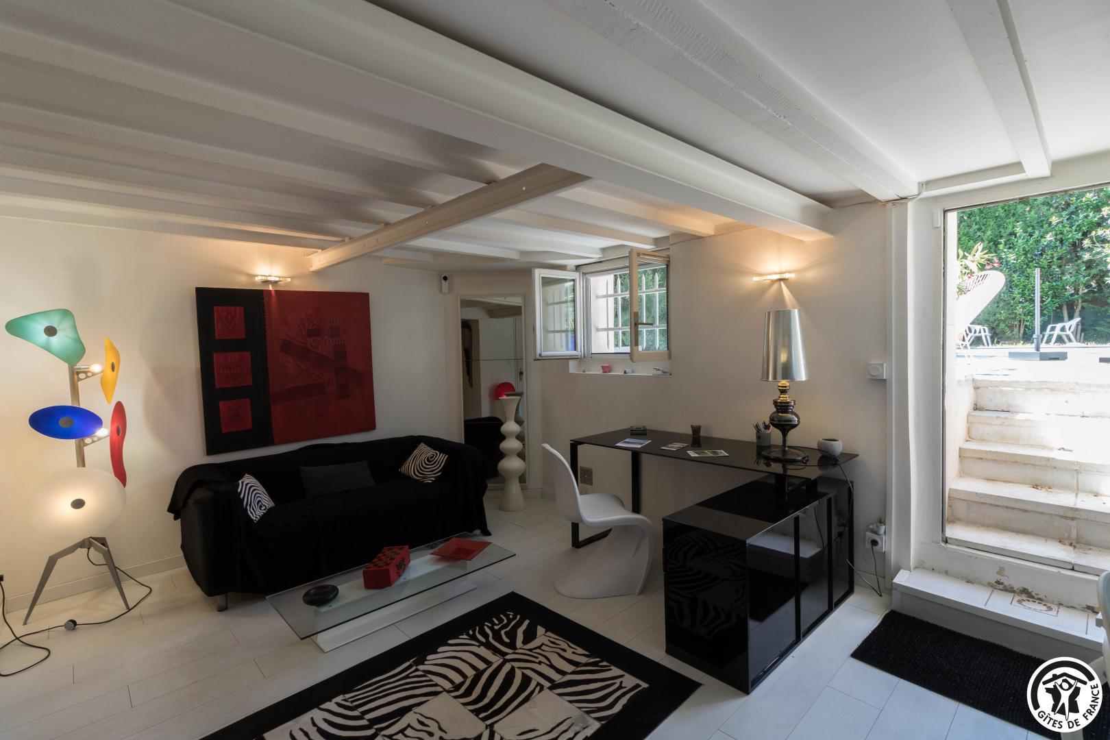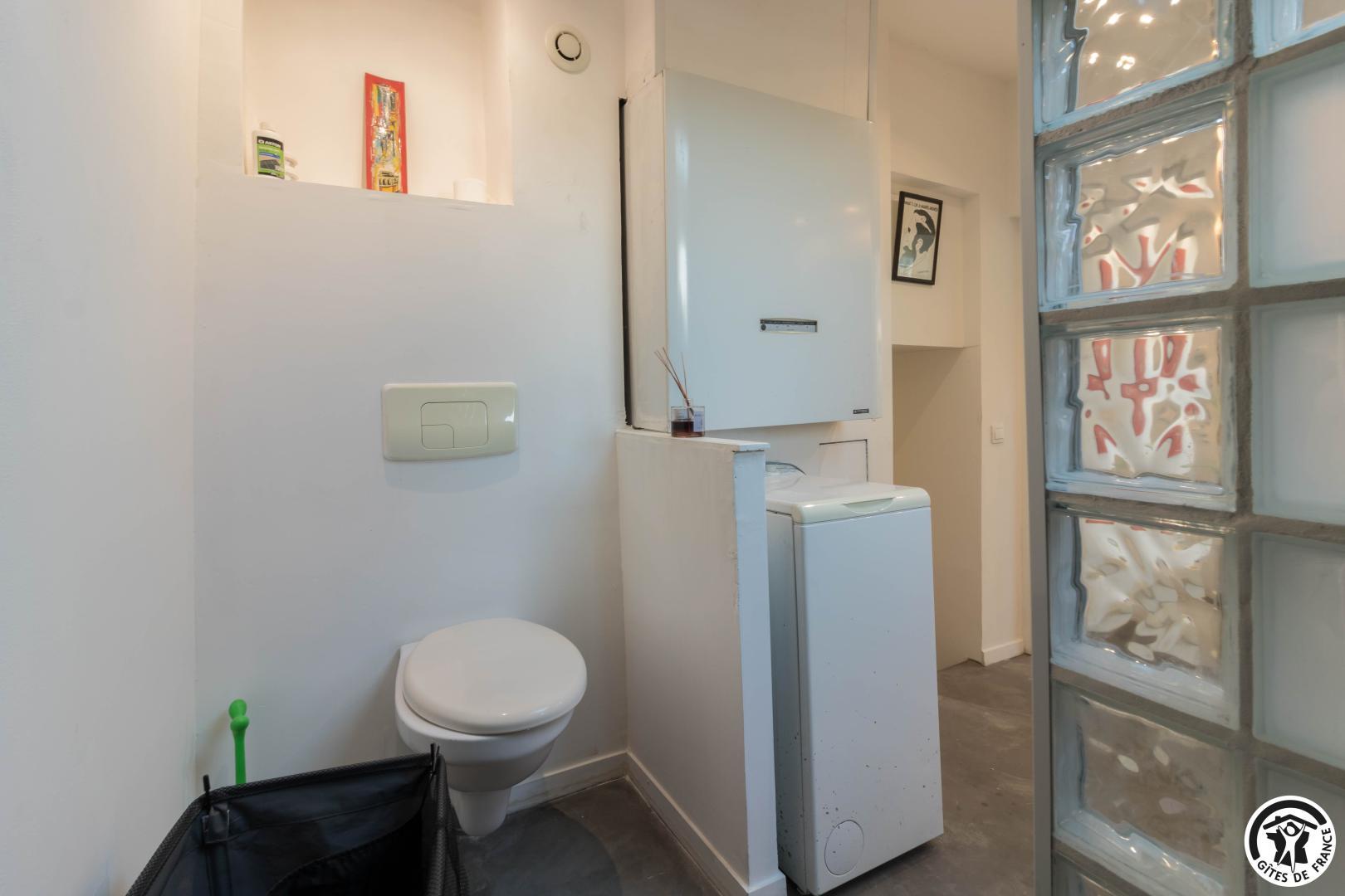 Esta casa rural de una sola planta, a nivel del jardín (en el nivel -1 de la casa del propietario, que vive arriba): la cocina/comedor se abre a un salón/estudio y a una zona de lectura; una zona de dormitorio (1 x cama de 140x190cm) también se abre a un baño, un lavabo y un WC; y una segunda zona de dormitorio (1 x cama de 140x190cm), sin ventanas, se abre a un cuarto de ducha/WC. No hay puertas entre los dormitorios y el cuarto de baño.