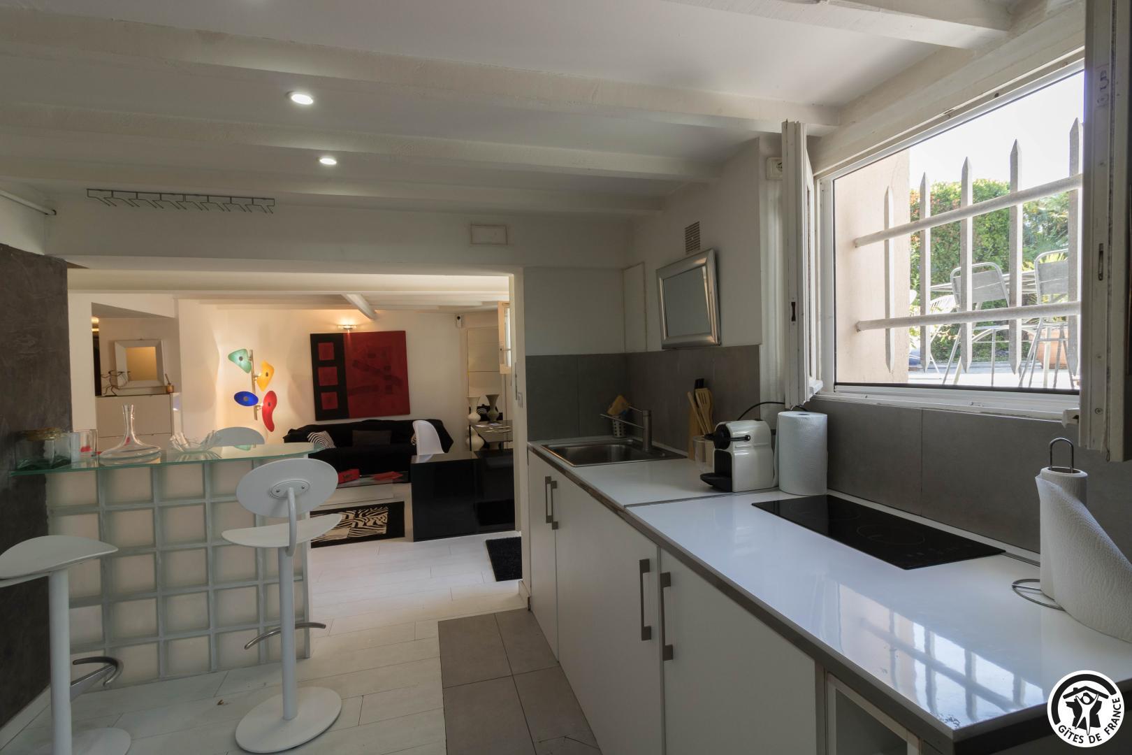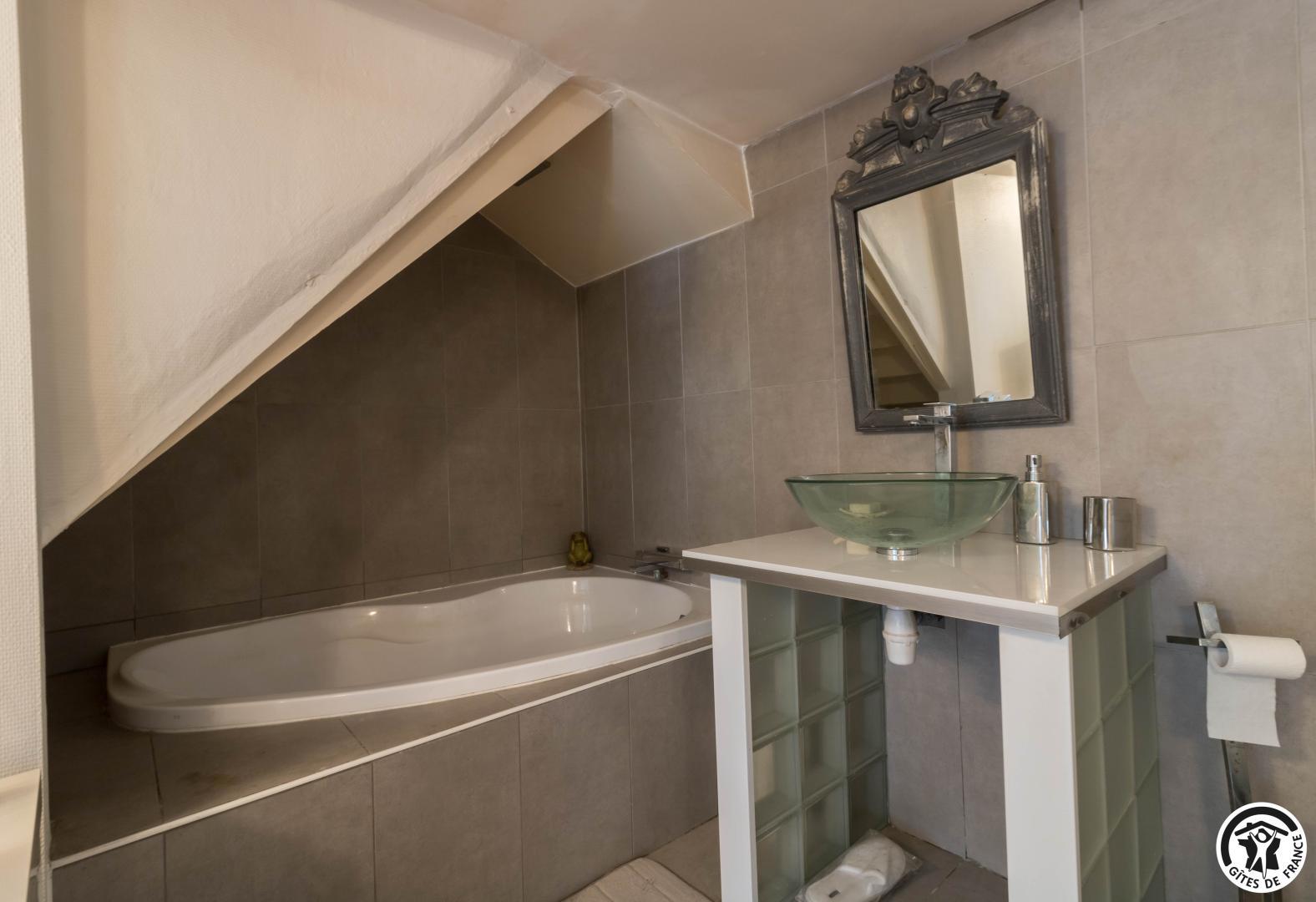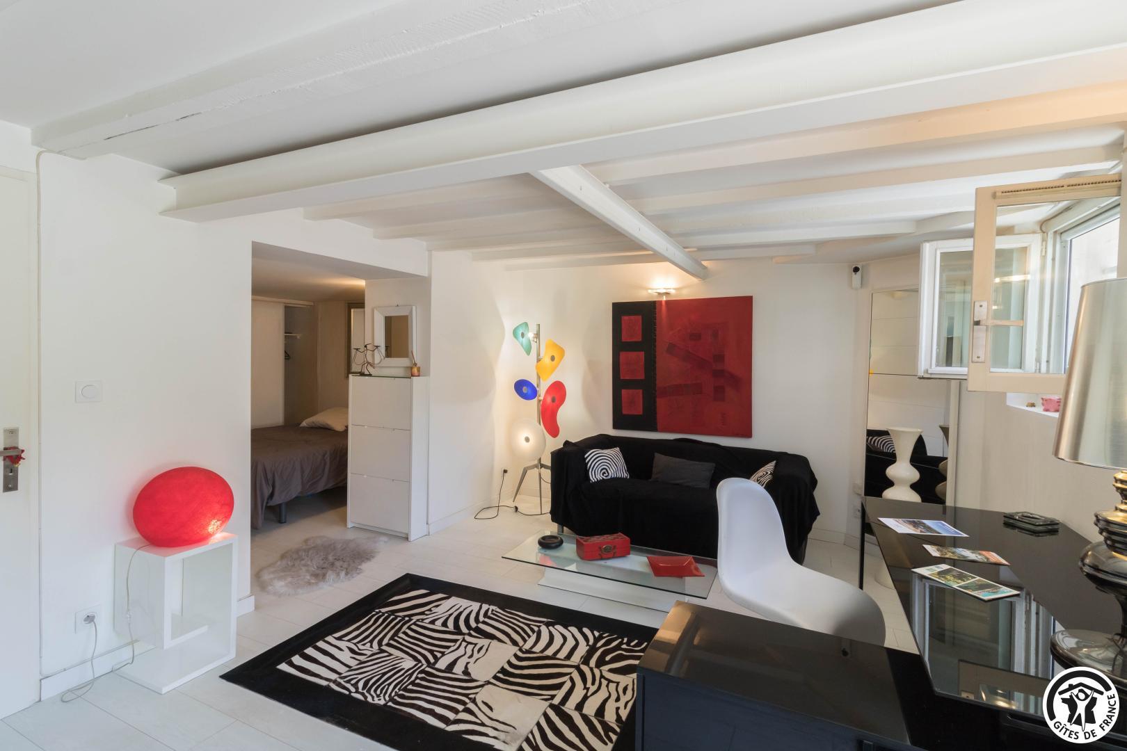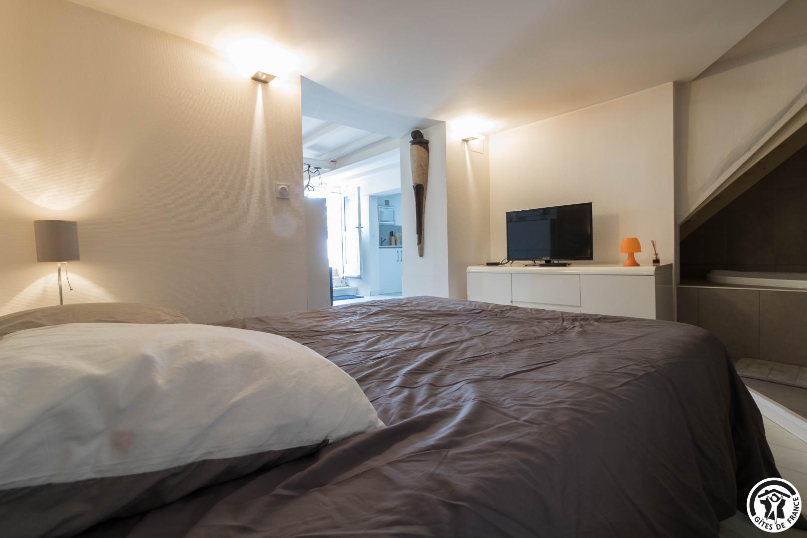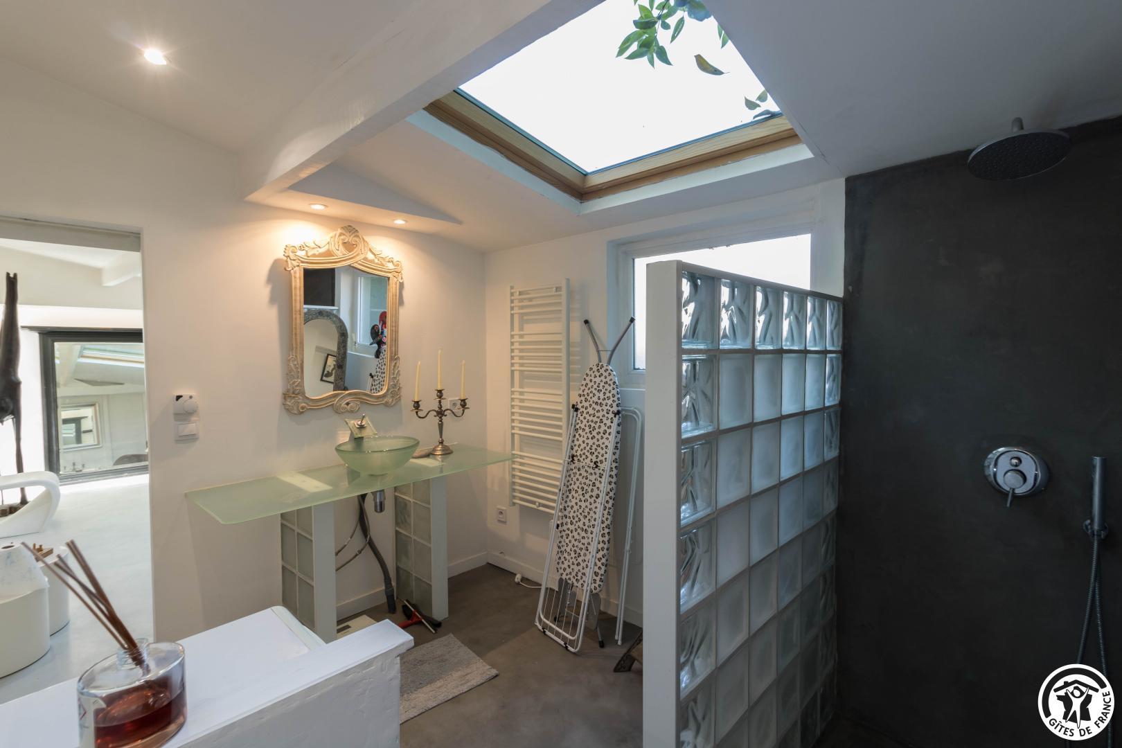 Esta casa rural de una sola planta, a nivel del jardín (en el nivel -1 de la casa del propietario, que vive arriba): la cocina/comedor se abre a un salón/estudio y a una zona de lectura; una zona de dormitorio (1 x cama de 140x190cm) también se abre a un baño, un lavabo y un WC; y una segunda zona de dormitorio (1 x cama de 140x190cm), sin ventanas, se abre a un cuarto de ducha/WC. No hay puertas entre los dormitorios y el cuarto de baño.