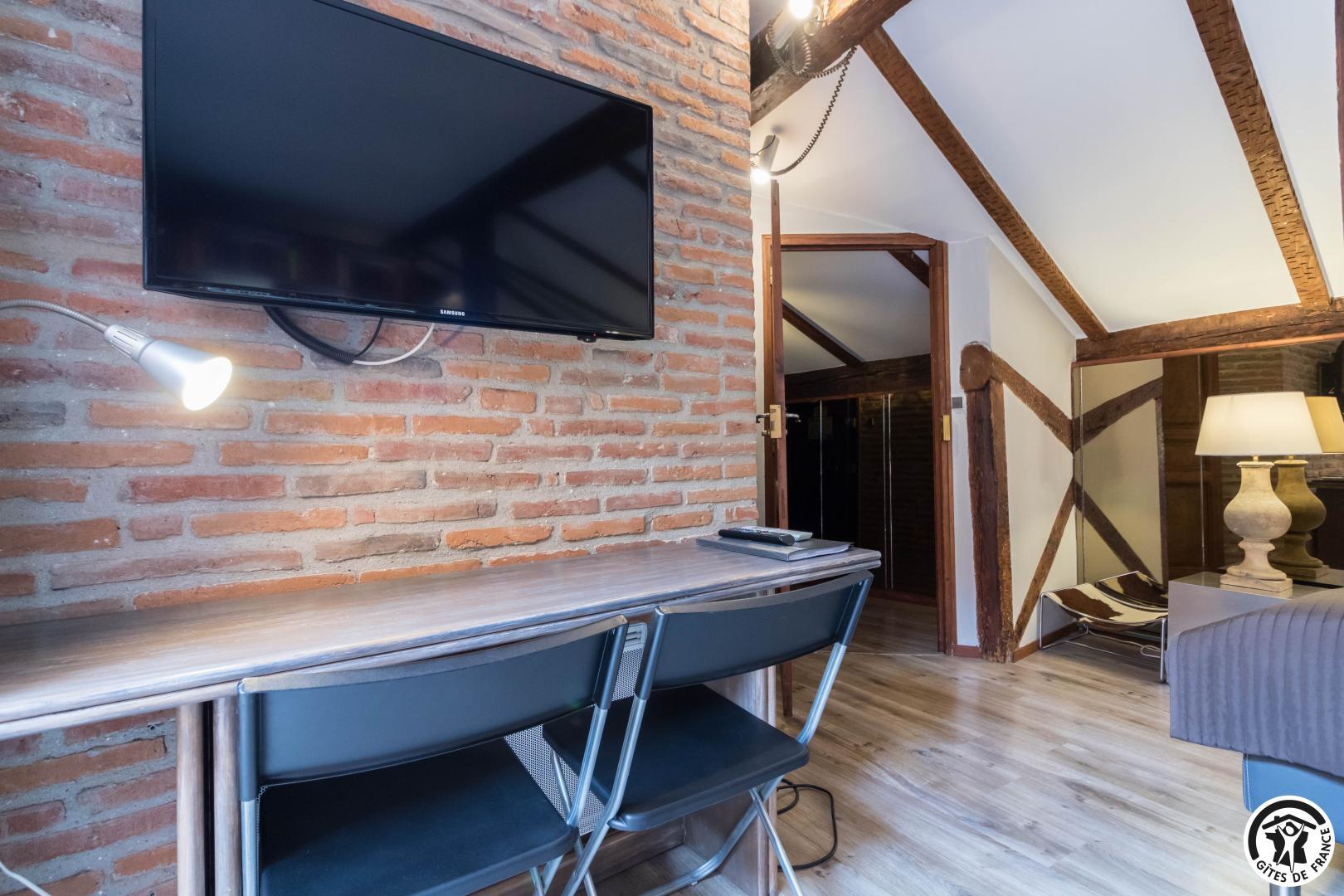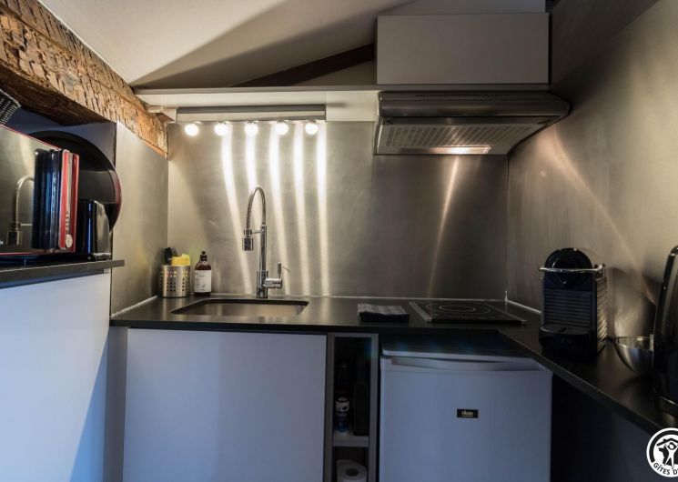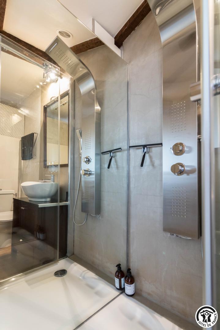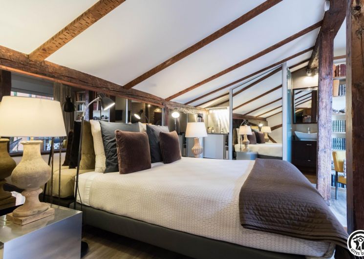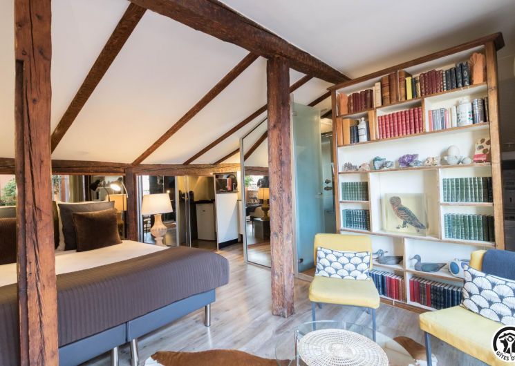 En la 4ª planta de la torre, este luminoso estudio con vistas ininterrumpidas a la ciudad combina autenticidad y modernidad: vigas centenarias, ladrillo visto, cómoda cama de 160 cm, cocina americana totalmente equipada, cuarto de baño contemporáneo con ducha de chorros y WC privado.