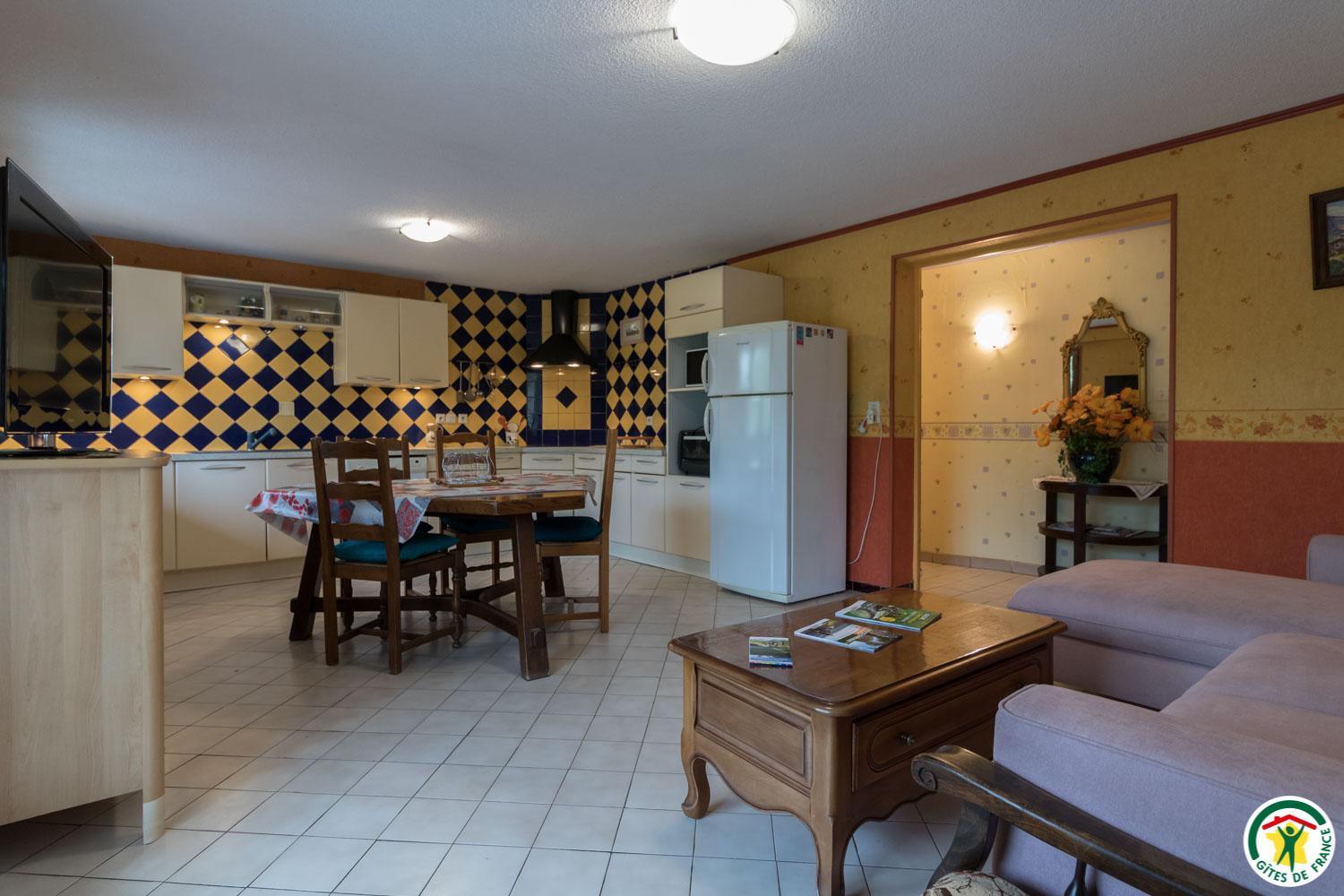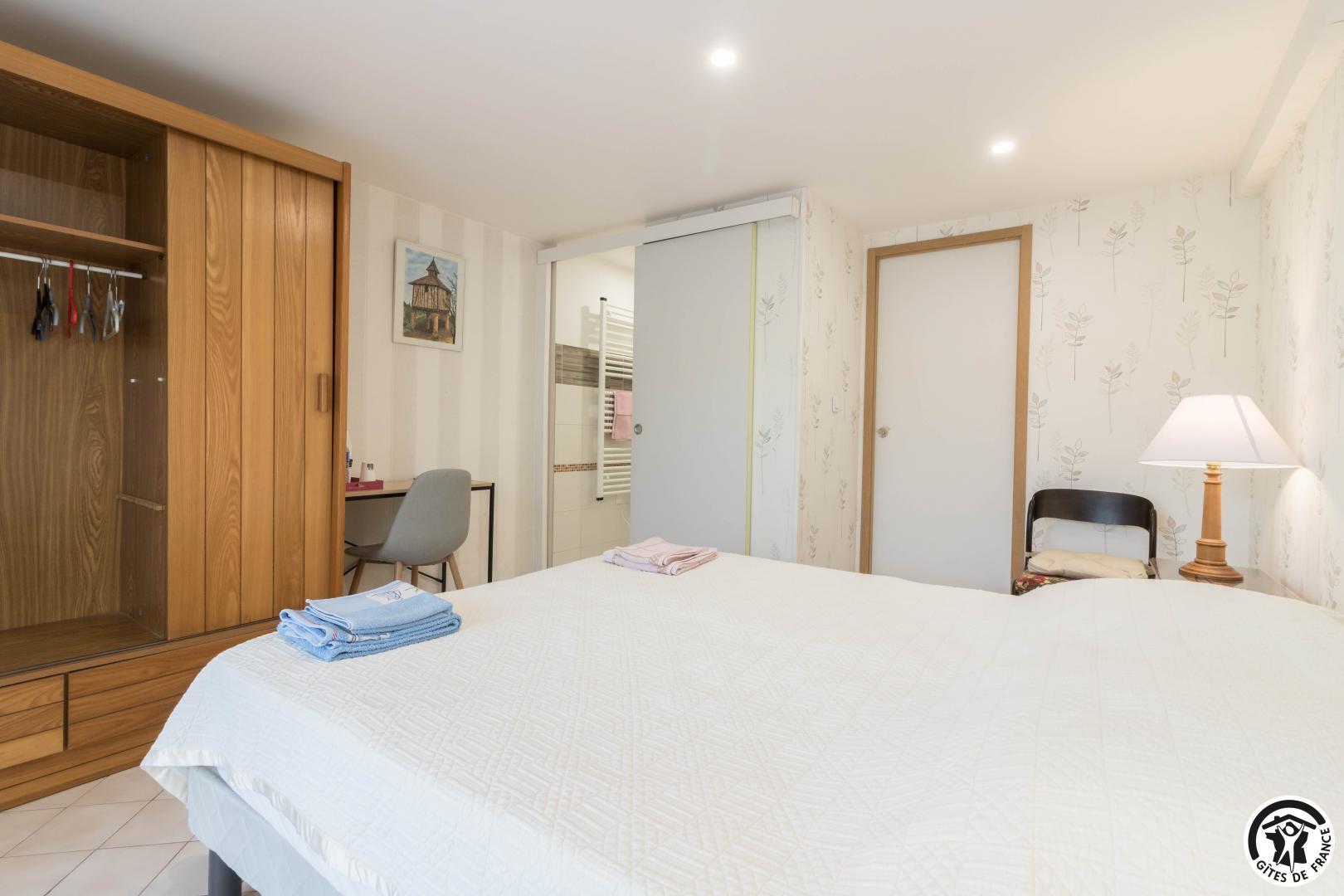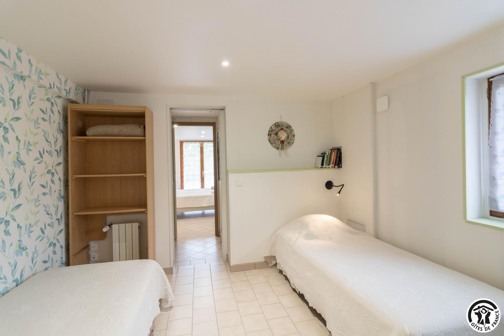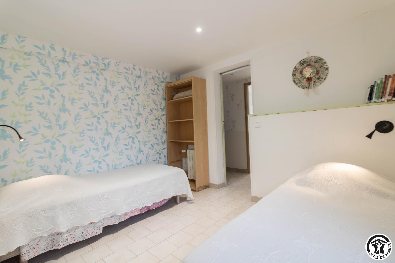 En la planta baja de la casa de la propietaria, accesible desde el exterior, esta habitación familiar ofrece 2 habitaciones separadas (4 camas individuales, 2 de las cuales pueden ser gemelas), cada una con su propio cuarto de ducha/WC. Uno de los dormitorios dispone de un escritorio. El desayuno se sirve en la sala de estar (salón, comedor y cocina equipada), accesible a su vez a los veraneantes. En el exterior, podrá relajarse en la terraza y en el jardín.