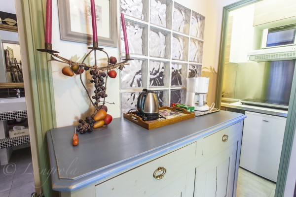Sur sa terrasse privative, vous passerez des soirées romantiques. TV 82cm LCD , lecteur DVD, WI FI. Petit coin cuisine dans un placard avec réfrigérateur 100 litres, four micro-ondes, évier, double plaque de cuisson à induction, vaisselle, cafetière, grille-pains, sèche cheveux, bouilloire. Salle de bains avec baignoire et douche séparées. W.c. Séparés. Machine à laver le linge à partager avec les propriétaires à votre disposition près du studio.