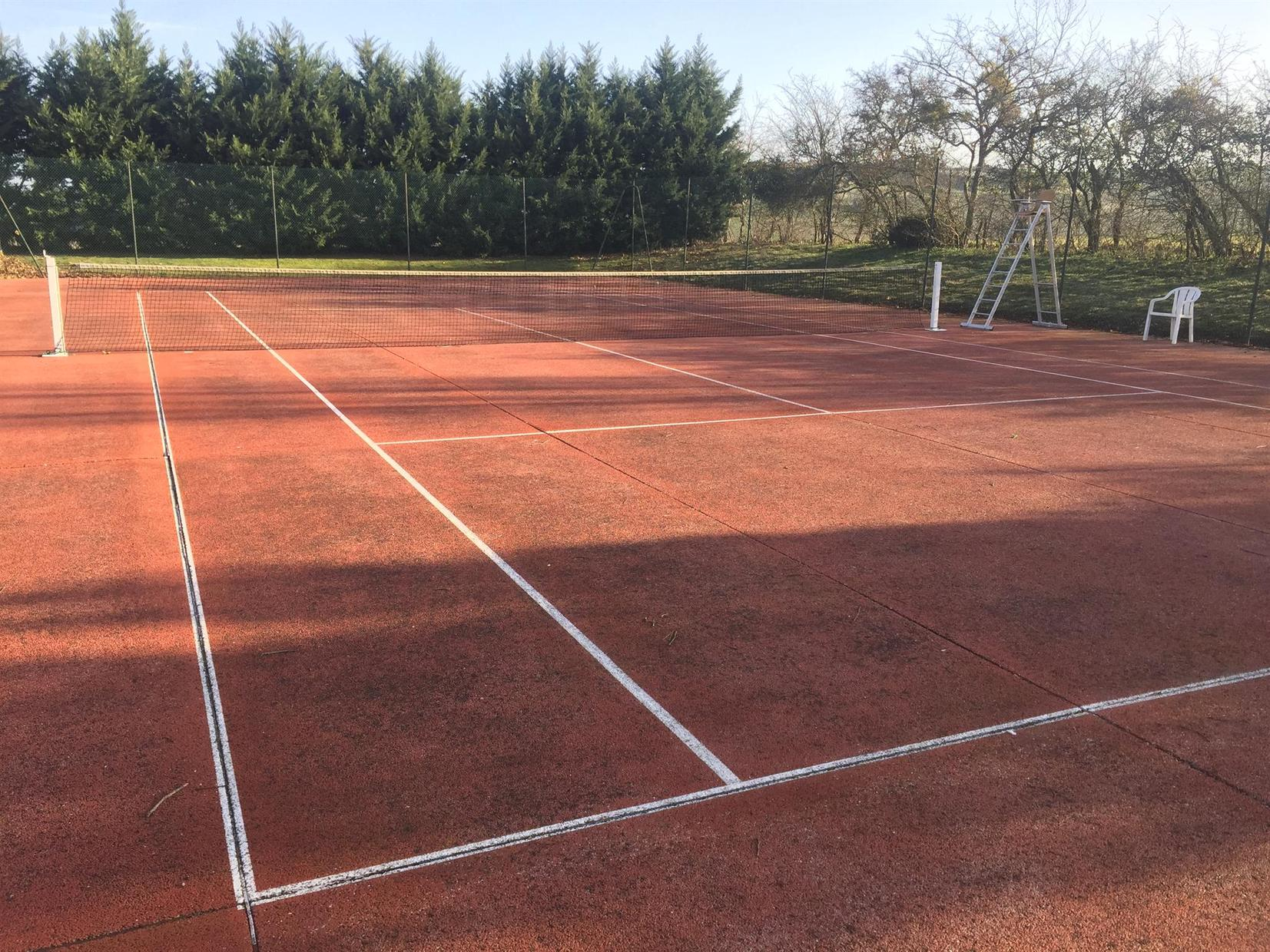 Resplandeciente fachada de tierra y ladrillo. Piscina, petanca y pistas de tenis.