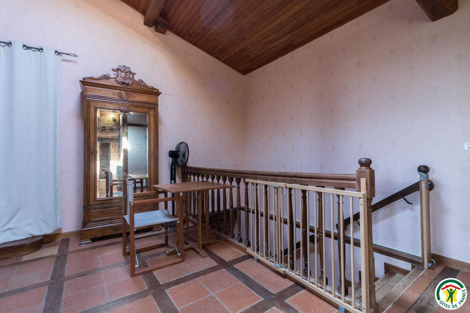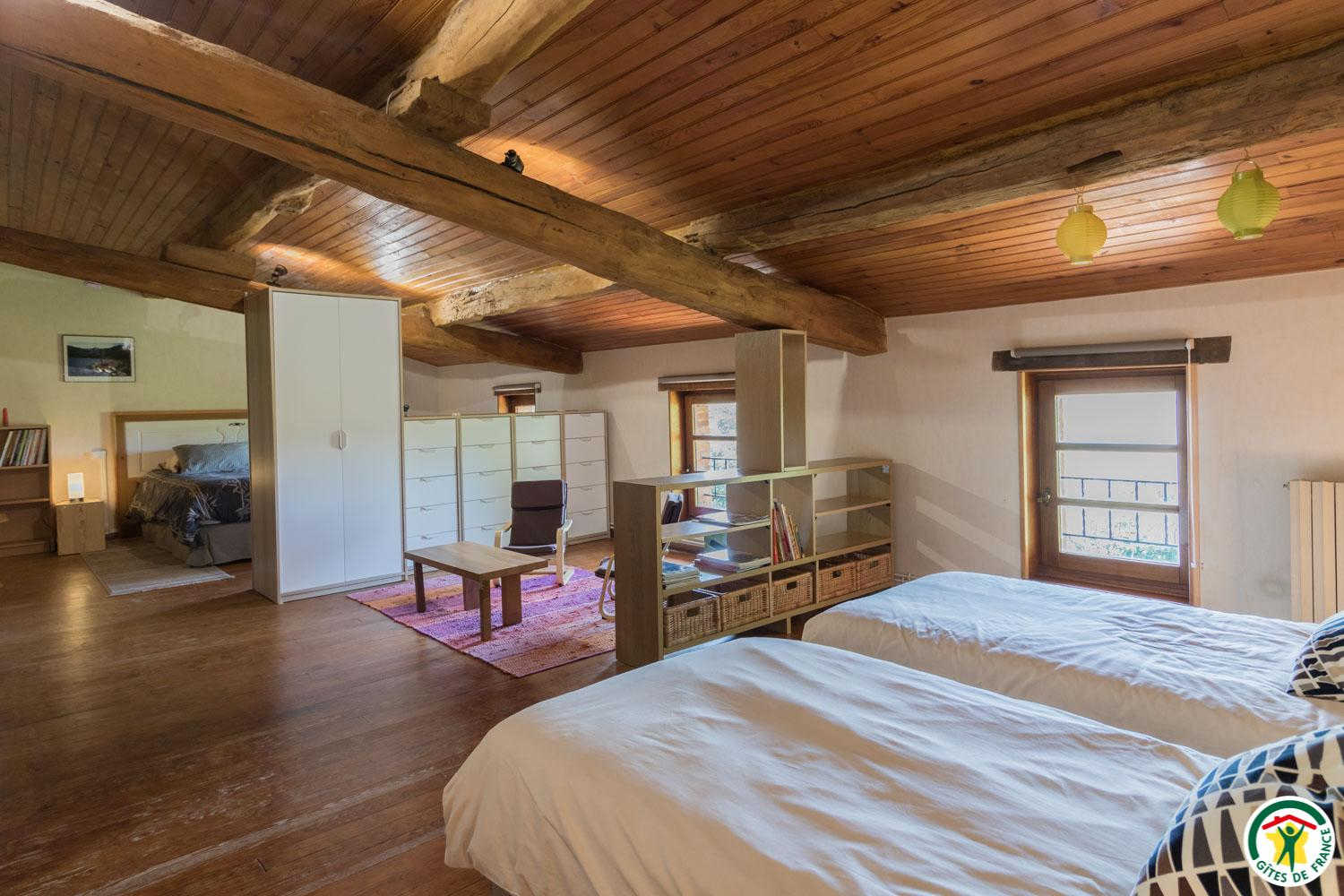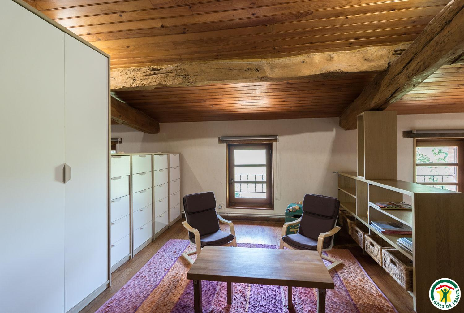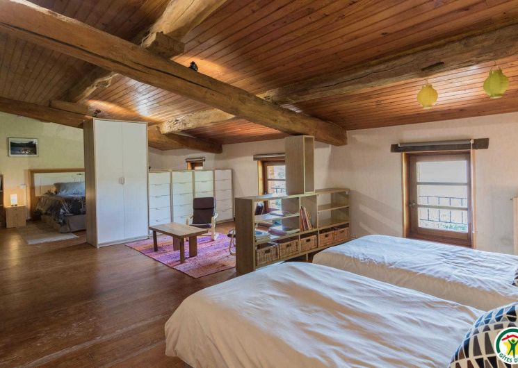 Arriba: gran salón (sofá, TV de pantalla plana, reproductor de DVD, radio HI FI, cama supletoria de 140 cm), gran dormitorio con 1 cama doble de 160 cm y 2 camas individuales de 90 cm, separados por una zona de juegos para niños. WC y lavabo. Calefacción central de gasoil. Muebles de jardín, tumbonas, sombrilla y barbacoa. Esta casa rural es contigua a la casa de los propietarios (pero no tiene vistas). Equipamiento para bebés (cuna y trona). Jardín común, no cerrado. No se admiten animales. Acceso a Internet. Posibilidad de teletrabajo.