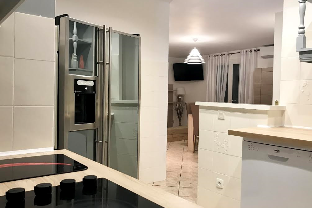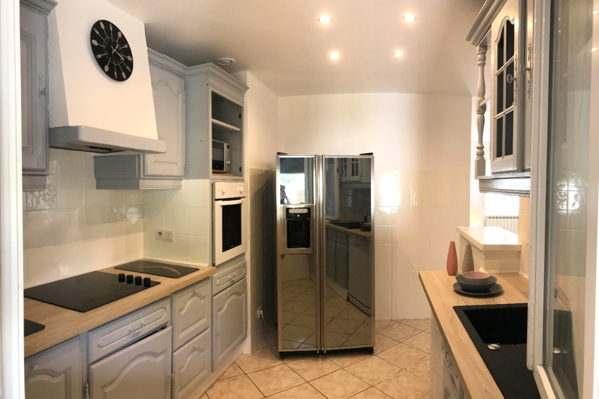 À l’intérieur, vous trouverez un spacieux salon lumineux et climatisé, ainsi qu’une cuisine parfaitement équipée avec un réfrigérateur américain, un lave-vaisselle, une plaque à induction, et bien plus encore.