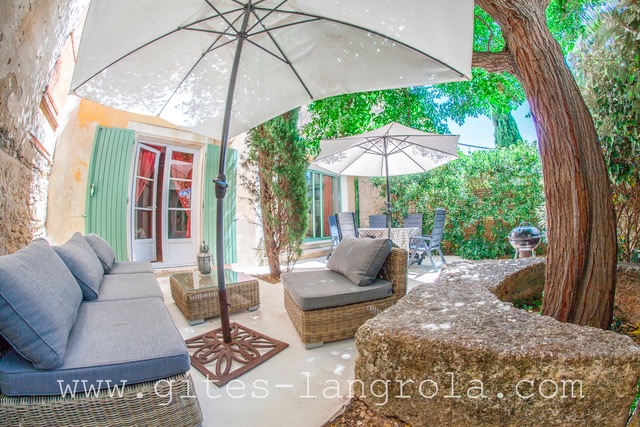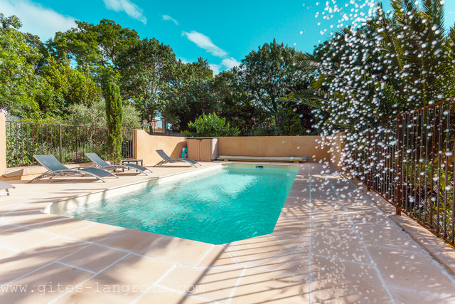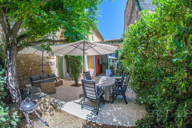Maison mitoyenne avec piscine 10x5m à partager, parking dans la propriété et espace extérieur privé de 50 m2 au calme avec salon de jardin à l’ombre d’un mélia.