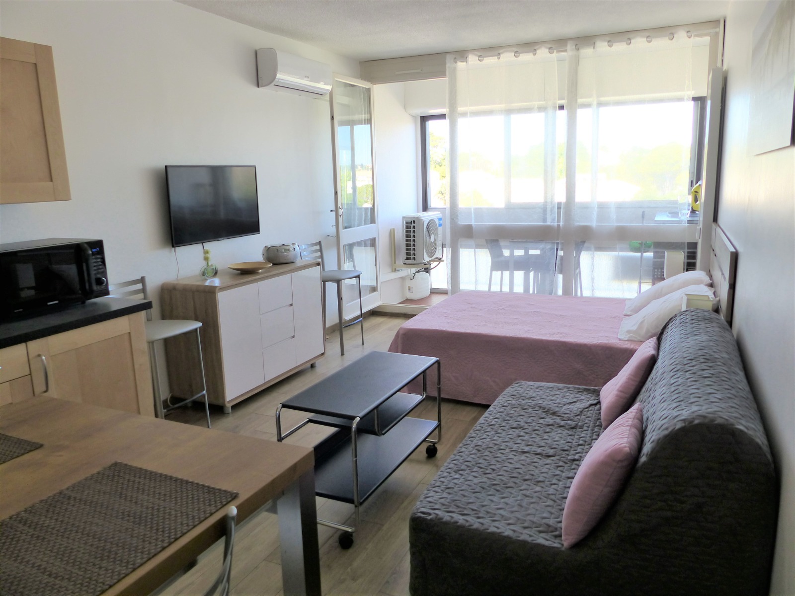 Cómodo estudio de 24,5 m2 en el 2º piso con 2 ascensores, residencia Les Bains. Logia cerrada de 4,5 m2. Situado a 300 m de los baños termales, cerca de todos los servicios. Consta de un hall de entrada, un cuarto de ducha con WC y lavadora, una cocina totalmente equipada (frigorífico/congelador, microondas/grill), un salón con una cama doble (140/190) más una litera (140/190). El aire acondicionado reversible, la calefacción eléctrica y el ventilador de techo garantizan el máximo confort. WIFI colectivo en el condominio Extras opcionales: Kit de ropa de casa, Mascota pequeña, vacunada y tranquila.