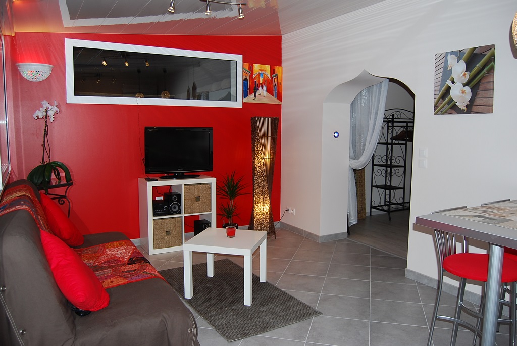 1 Chambre lit en 140, salle-d ‘eau avec douche à l’italienne, vasque en marbre, lave-linge. Séjour 1 clic clac, écran plat HD, téléphone, mini-chaîne, lecteur DVD, lumières d’ambiance…