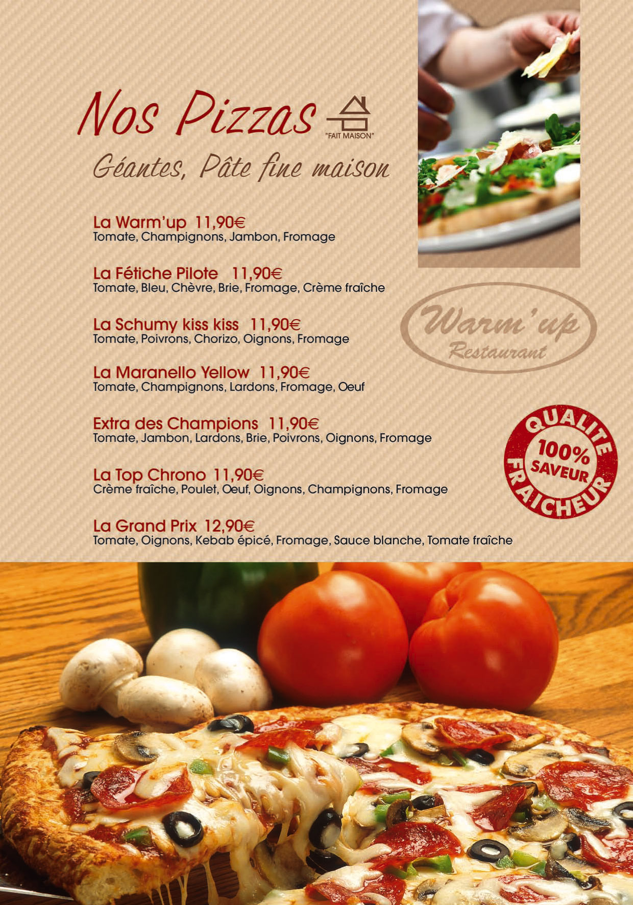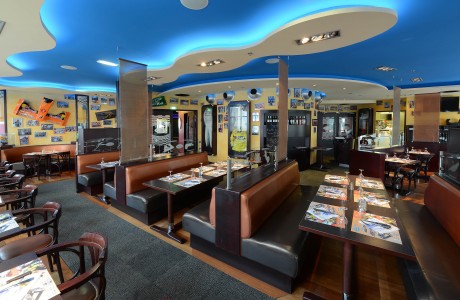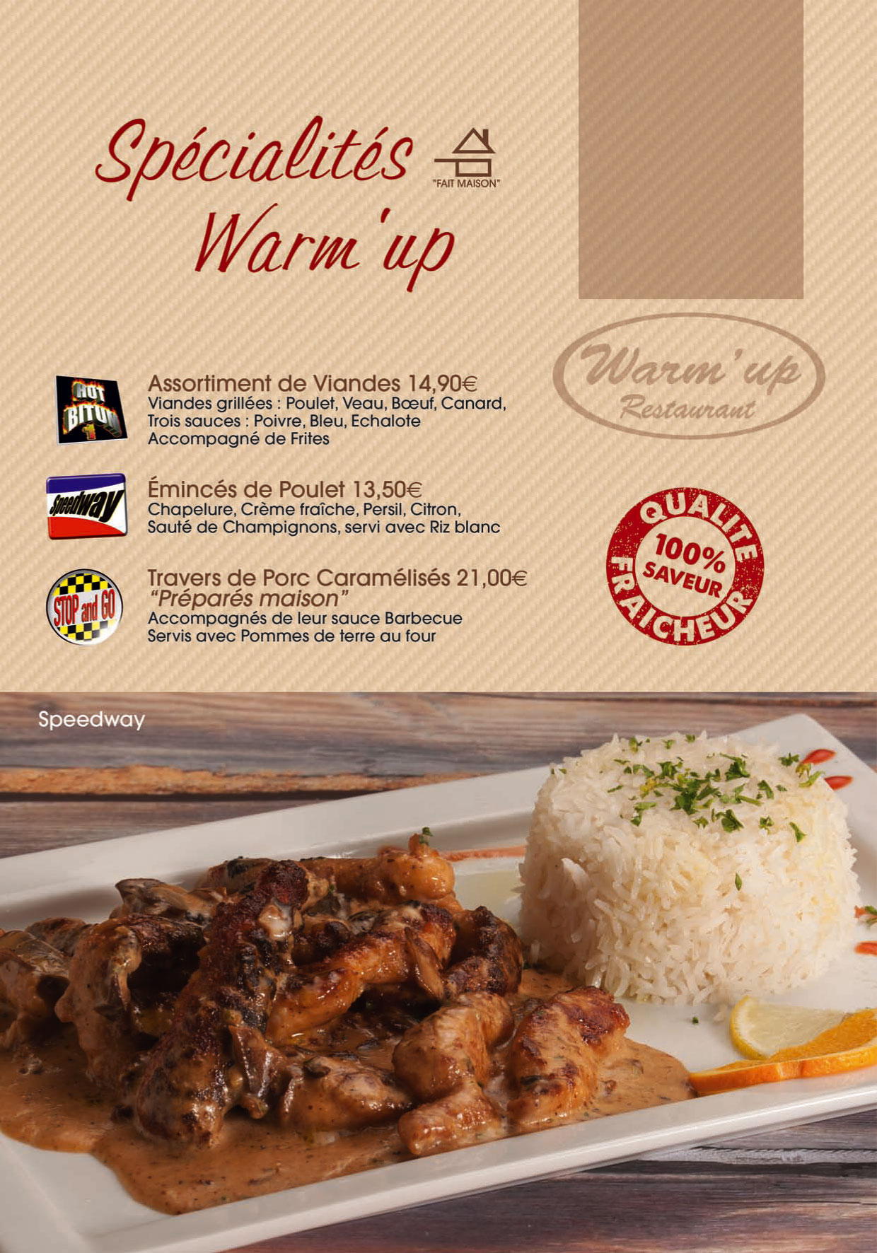 Découvrez un resto qui décoiffe ! Bolides en furie et maxi-hamburgers : le Warm’up restaurant électrise vos papilles dans son ambiance super “racing”. Dégustez des plats exquis (produits frais) mitonés par le chef : viandes grillées, pizzas géantes, vacherin royal, spécialités maison avec 22 plats “top-chrono” à 9,90€.
