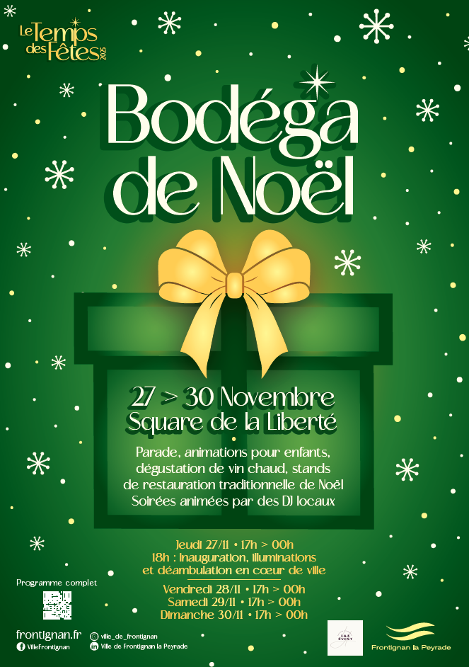 Durant tout le week-end, plongez-vous dans l’ambiance chaleureuse de Noël et venez partager un moment festif et convivial autour d’une bodéga.Stands de spécialités de Noël, vin chaud, douceurs locales, parade féérique et animations pour enfants… durant quatre jours, convivialité et gourmandise seront au rendez-vous. Sans oublier les prestations de jeunes DJ frontignanais, qui enflammeront les nuits du jeudi au samedi.Et aussi : petits et grands pourront découvrir l’atelier du père Noël réalisé par l’association Le Temps Jadis, rue du Député Lucien-Salette.