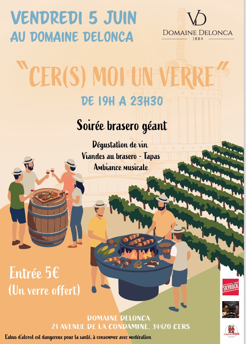 Cer(s) moi un verre est de retour au Domaine Delonca, avec sa soirée brasero géant. Profitez d’une soirée conviviale au Domaine Delonca, où l’on se retrouve pour partager, savourer et profiter d’un moment gourmand autour de bons vins, de tapas et de grillades. C’est un moment de détente et de convivialité, où musique, bonne humeur et échanges se mêlent pour passer un moment entre amis ou en famille.