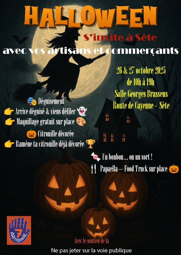 Halloween s’invite à Sète les dimanche 26 et lundi 27 octobre 2025, de 10h à 19h, à la Salle Georges Brassens – Route de Cayenne.Organisée par l’association 7 Artisanal, cette première édition réunira artisans et commerçants locaux dans une ambiance festive et familiale.Au programme :Défilé costumé : enfants et adultes déguisés participeront au grand défilé d’Halloween (dimanche).Maquillage gratuit pour petits et grands.Concours de citrouilles décorées : ramenez votre citrouille déjà décorée et participez au concours devant le jury (lundi).Distribution de friandises sous le signe d’« un bonbon ou un sort ».Le food truck Papaella : plats salés pour les gourmands, et crêpes & gaufres tout l’après-midi pour les amateurs de sucré.Un rendez-vous à ne pas manquer pour célébrer Halloween et découvrir le savoir-faire des artisans et commerçants de Sète et des environs.Avec le soutien de la Ville de Sète.