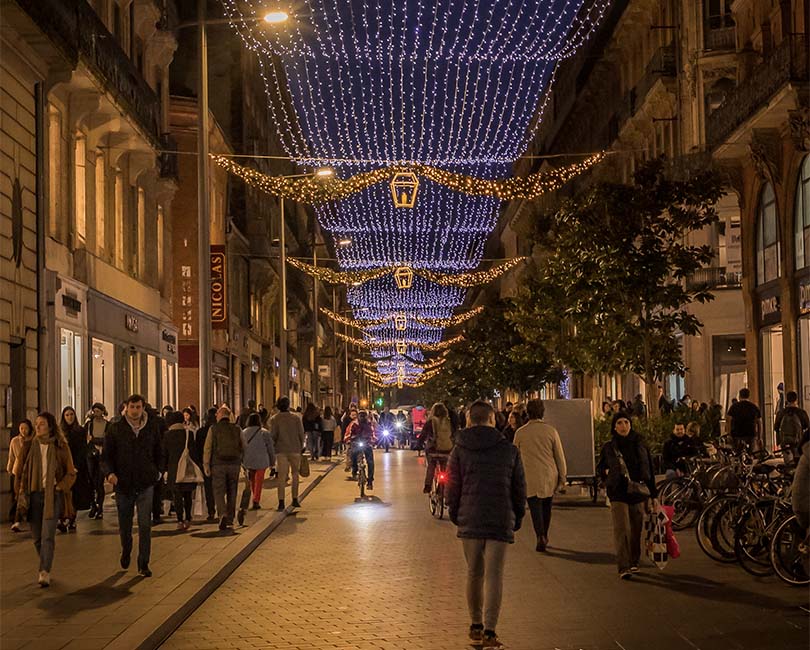 Envie de profiter des illuminations de Noël à Toulouse ? Voici quelques idées de balades pour les découvrir ! La rue de Metz se distingue avec ses traversées lumineuses ornées de boules dorées, ses projections au sol et deux décors 3D, dont un ours Teddy aux Augustins. La rue d’Alsace-Lorraine propose un long plafond lumineux de 800 mètres agrémenté de jabots en sapin et de lanternes. Entre la place Esquirol et la place des Carmes, vous pouvez admirer les perles d’étoiles puis les Perséides. Enfin, la place Wilson met en valeur la fontaine Goudouli avec ses arches lumineuses entièrement recyclables.