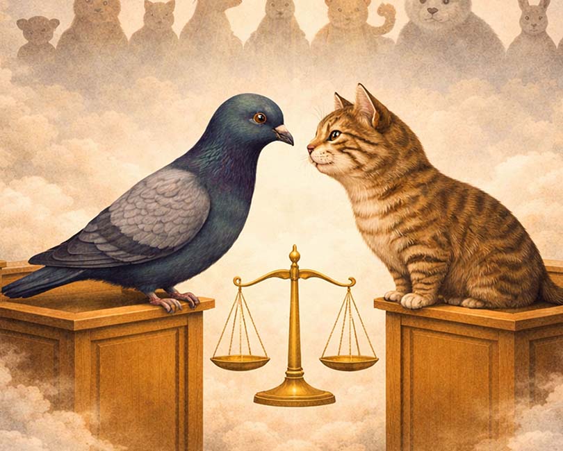Quand un chat français et une pigeonne anglaise se rencontrent à Paris et deviennent amis, c’est tout le rapport entre proies et prédateurs qui est bouleversé. Ils sont rapidement arrêtés pour trouble à l’ordre naturel. L’affaire est portée devant les tribunaux où Gigi, une petite fille au caractère bien trempé, sera l’avocate de la défense. Coupables ou innocents ? La question s’envenime quand les végétaux et les forces célestes s’en mêlent…