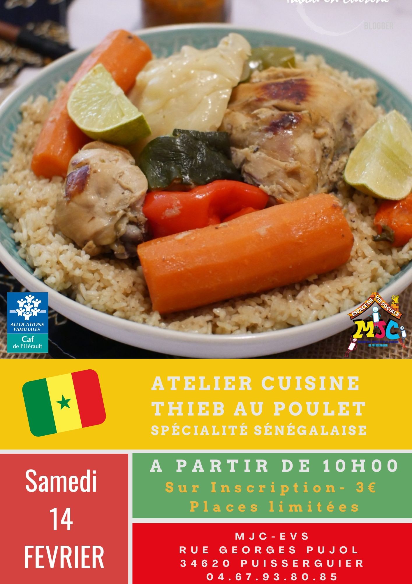 Atelier cuisine, spécialité Sénégalaise Venez découvrir ce plat traditionnel: le Thieb au poulet accompagné de son riz et de légumes, préparé avec soins par notre cuisinière Awa.