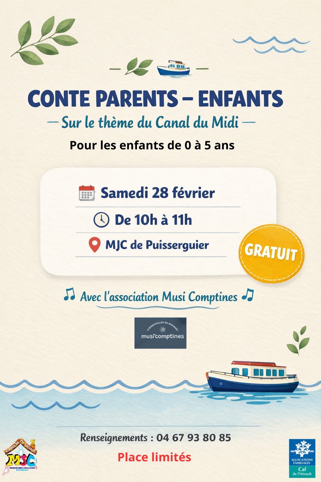 L’association Musi’Comptines, vient nous faire découvrir une histoire musicale sur le Canal du Midi avec manipulation d’instruments, chant et éveil corporel.