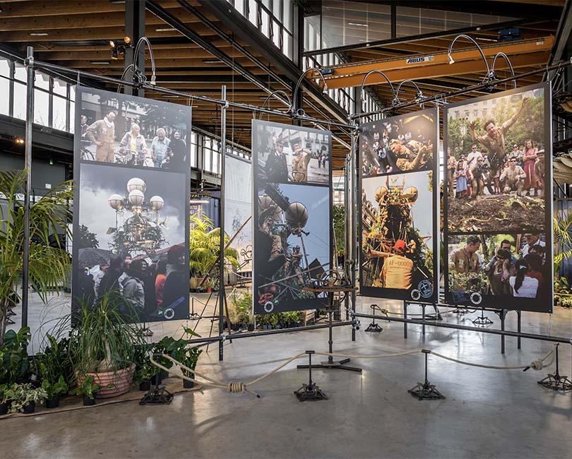 Imposante et fascinante, L’Aéroflorale II s’élève à 15 mètres de haut, déploie 10 mètres d’envergure et incarne une prouesse d’ingénierie artistique. Posée sur ses quatre pattes métalliques, surmontée de sa serre centrale et de ses ballons aérostatiques, elle semble prête à reprendre son envol à tout instant. À son bord, une expédition imaginaire de chercheurs explorateurs parcourt le monde à la recherche de végétaux capables de produire de l’électricité : le phytovoltaïsme, une science aussi réelle que surprenante.
