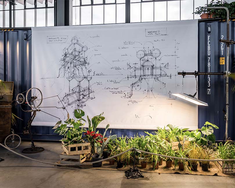 Autour de la serre, découvrez un laboratoire botanique spectaculaire, peuplé de machines insolites : certaines font rougir les pommes, d’autres caressent les plantes ou les mettent sur écoute. Ici, le vivant devient acteur, observé, expérimenté et mis en scène avec humour et délicatesse.
