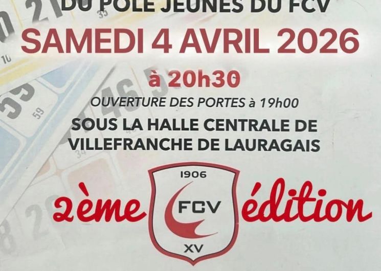 Loto du pôle jeunes du FCV le Samedi 4 avril 2026 à 20H30 dans la Halle centrale de Villefranche de Lauragais avec 1850 euros de bons d’achats (20 quines et 5 cartons pleins)