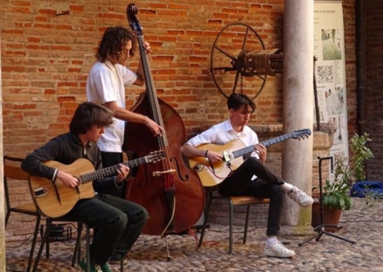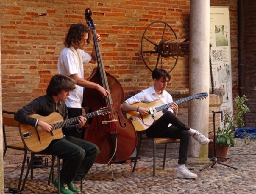 Changement d’ambiance avec le quatuor Swing23 qui fait résonner la cour du musée aux notes de Django Reinhardt et des standards du jazz pour une fin soirée cool et festive !