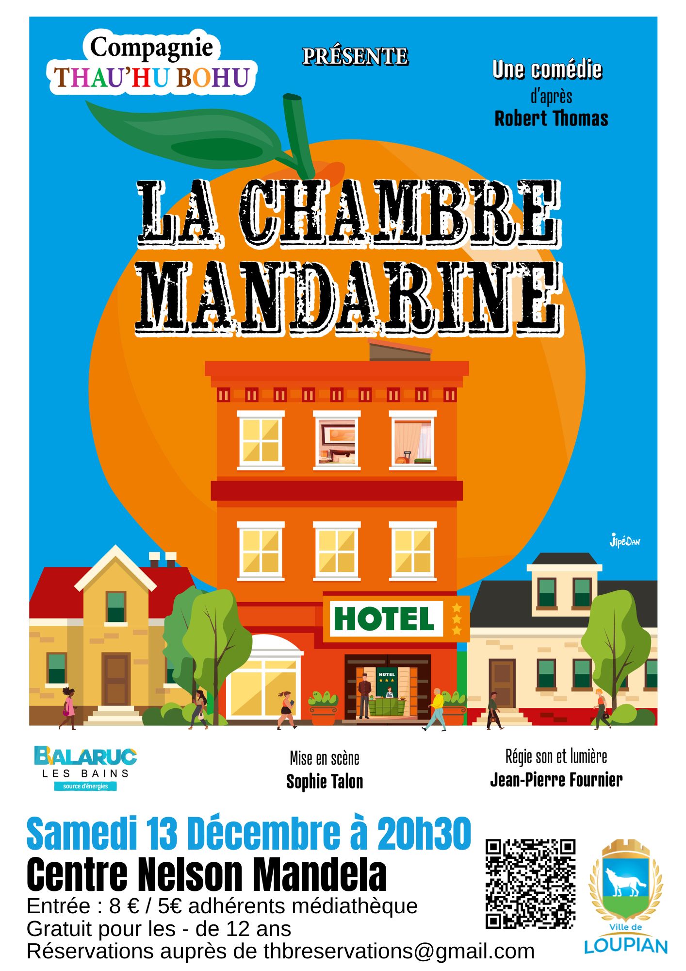Levendredi 13 décembre à 20h30, rendez-vous auCentre Nelson Mandelapour découvrir la nouvelle comédie de la Compagnie :La chambre Mandarine.Plongez dans le Paris des années 80, au cœur d’un petit hôtel où la fameuse chambre Mandarine voit défiler des clients hauts en couleur ! Aux côtés d’AdrienetLoulou, vivez une succession desituations cocasses, loufoques et rocambolesques, ponctuées derencontres aussi drôles qu’attachantes.Un spectacle à savourer sans modération, plein de rythme, d’humour et de bonne humeur !Avec :Myriam Bacri, Marie-Claude Fernandez, Georges Herpin, Christine Liby, Stéphane Merland, Christine Rico, Nicole Rozet, Philippe VasseurMise en scène :Sophie Talon, d’après une comédie de Robert ThomasTarifs :8 € / 5 € (adhérents médiathèque et usagers du CCAS)Gratuit pour les moins de 12 ansRéservation conseillée :thbreservations@gmail.comRèglement sur place