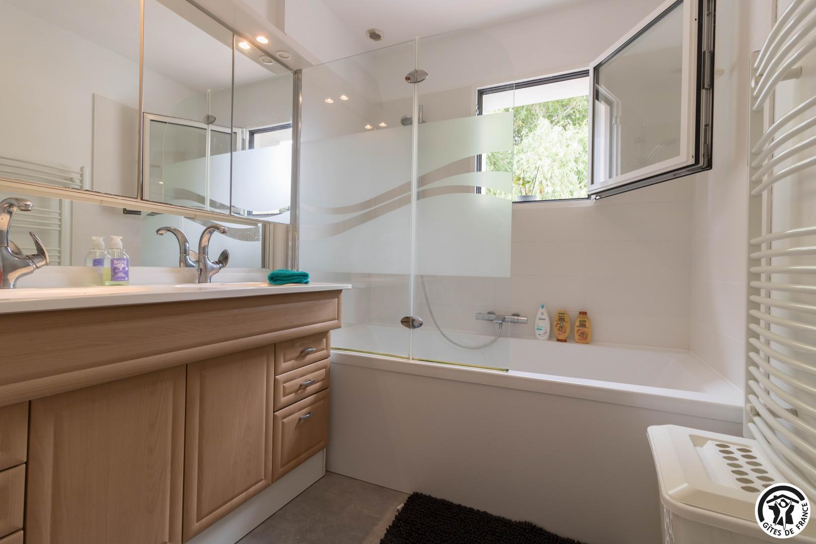 Gîte de plain-pied : séjour avec coin salon, espace repas et cuisine intégrée, 3 chambres (1 lit double en 140*190cm, salle de bains séparée et WC indépendant)(1 lit double en 140*190cm, douche, vasque et WC)(1 lit double en 140*190cm, douche et vasque), buanderie (lave-linge et sèche-linge).
