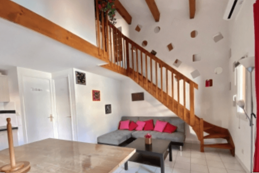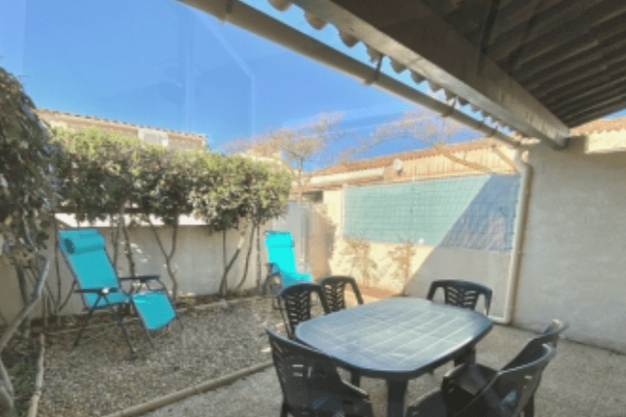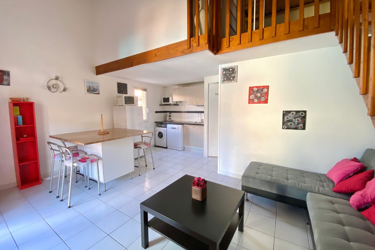 Villa de 40 m² semi-individuelle en duplex + terrasse et jardin. Couchages : lit superposé dans la mezzanine et 1 lit en 140 cm dans la chambre du haut. Salle d’eau avec douche, WC séparés. Distance de la plage environ 400 m. Equipements : TV, LAVE-LINGE, LAVE-VAISSELLE, MICRO-ONDES FOUR CLIMATISATION. PISCINE. PARKING N°18.. Référence Agence : 303