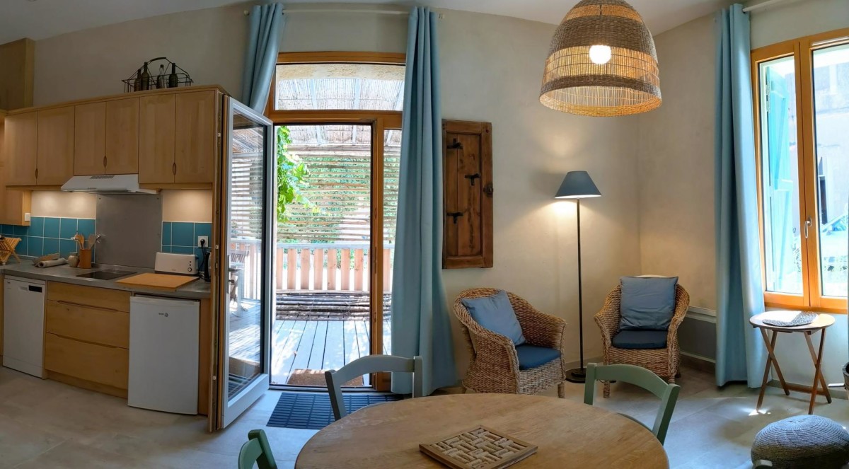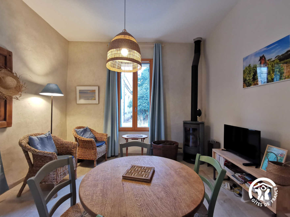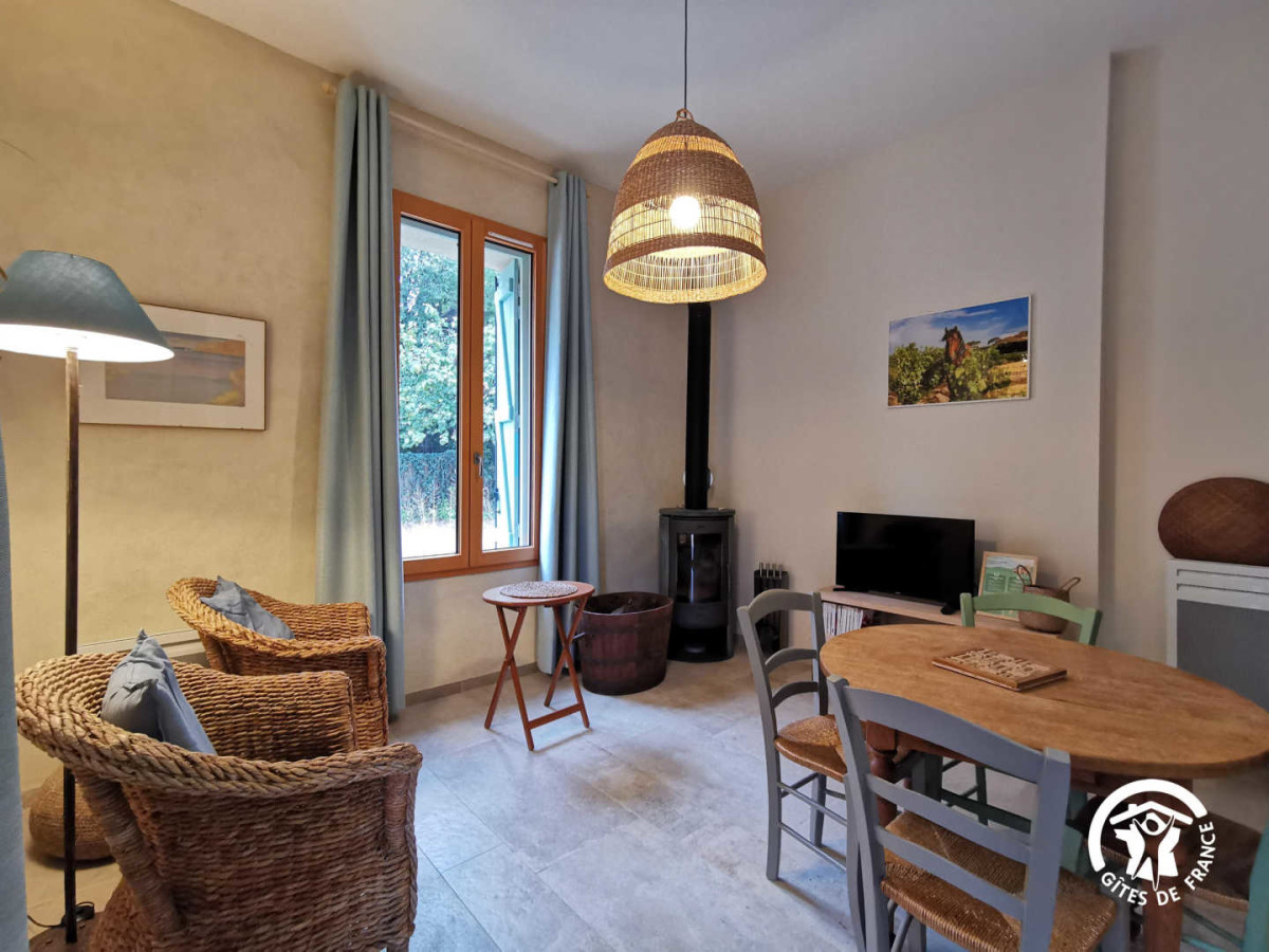 Lentisque est un écogîte au cœur d’un domaine viticole, Le Domaine du Château de Stony, producteur de vins biologiques entre Sète et Montpellier, sur la commune de Frontignan Lapeyrade. Situé dans le ramonétage, ancienne résidence du régisseur, ce gîte a été complètement rénové dans le respect du bâti ancien, avec des matériaux naturels et sains (bois, chaux, isolants biosourcés). Le logement de 45 m2 en duplex, se compose: Au rdc : 1 pièce à vivre de 21m² avec cuisine équipée, salle à manger, salon et wc. Poêle à bois performant et chauffage électrique si nécessaire pour les soirées d’hiver. Il n’y a pas de climatisation mais le gite est très bien isolé et pensé depuis sa construction pour garder la fraicheur l’été. Des ventilateurs sont à disposition aussi. A l’étage : 1 chambre de 19m2, avec 2 lits (80×200 cm) modulables en 160cm, salle de bain avec douche et wc. De quoi lire et des jeux sont à disposition pour de bons moments en famille ou entre amis. A l’extérieur: aux beaux jours, profitez d’une petite terrasse privative ouverte vu sur la cour du domaine.. Barbecue commun aux 3 gîtes. Depuis le domaine vous profiterez directement des chemins de garrigue à pied ou à vélo. Les vacanciers à vélos sont les bienvenus, la voie verte réaménagée est toute proche -1,8km. Nous sommes labélissés « Accueil Vélo ». Il est aussi possible de louer des vélos sur place avec un prestataire local. L’occasion aussi de découvrir l’activité viticole. Les propriétaires proposent des visites de caves et la dégustation de leurs différentes cuvées si vous le désirez. Vous serez tout près des plages de Frontignan 10 min en voiture, de la belle ville de Sète à 6 km, au bord de l’Etang de Thau, de la mer Méditerranée et des plages sauvages des Aresquiers, à 1 Km du Massif de la Gardiole et à 20 mn de Montpellier, ou encore de la cathédrale de Villeneuve les Maguelone, Pézenas, le Lac du Salagou… Electricité: 3kw/jour/personne inclus au tarif. Equipement bébé sur demande
