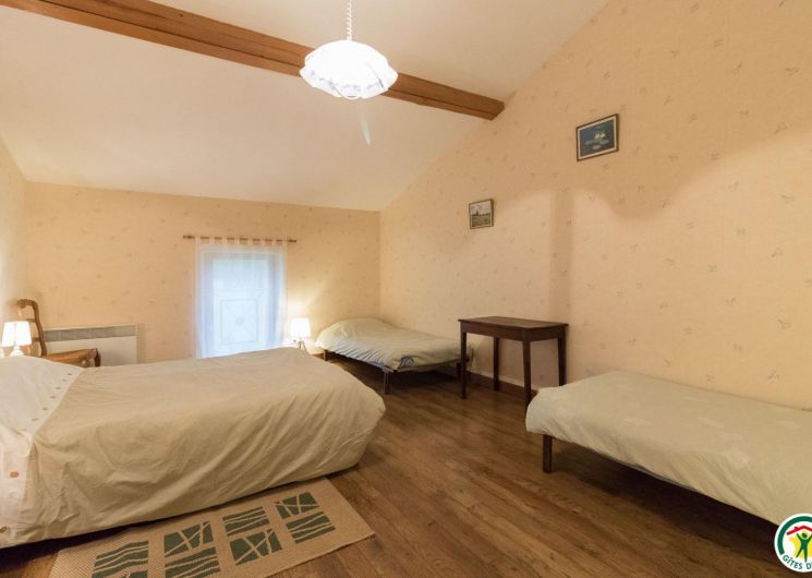 – à l’étage : chambre Familiale (1 lit 2 personnes en 140cm + 2 lits 1 personne en 90cm + salle d’eau et WC séparé).