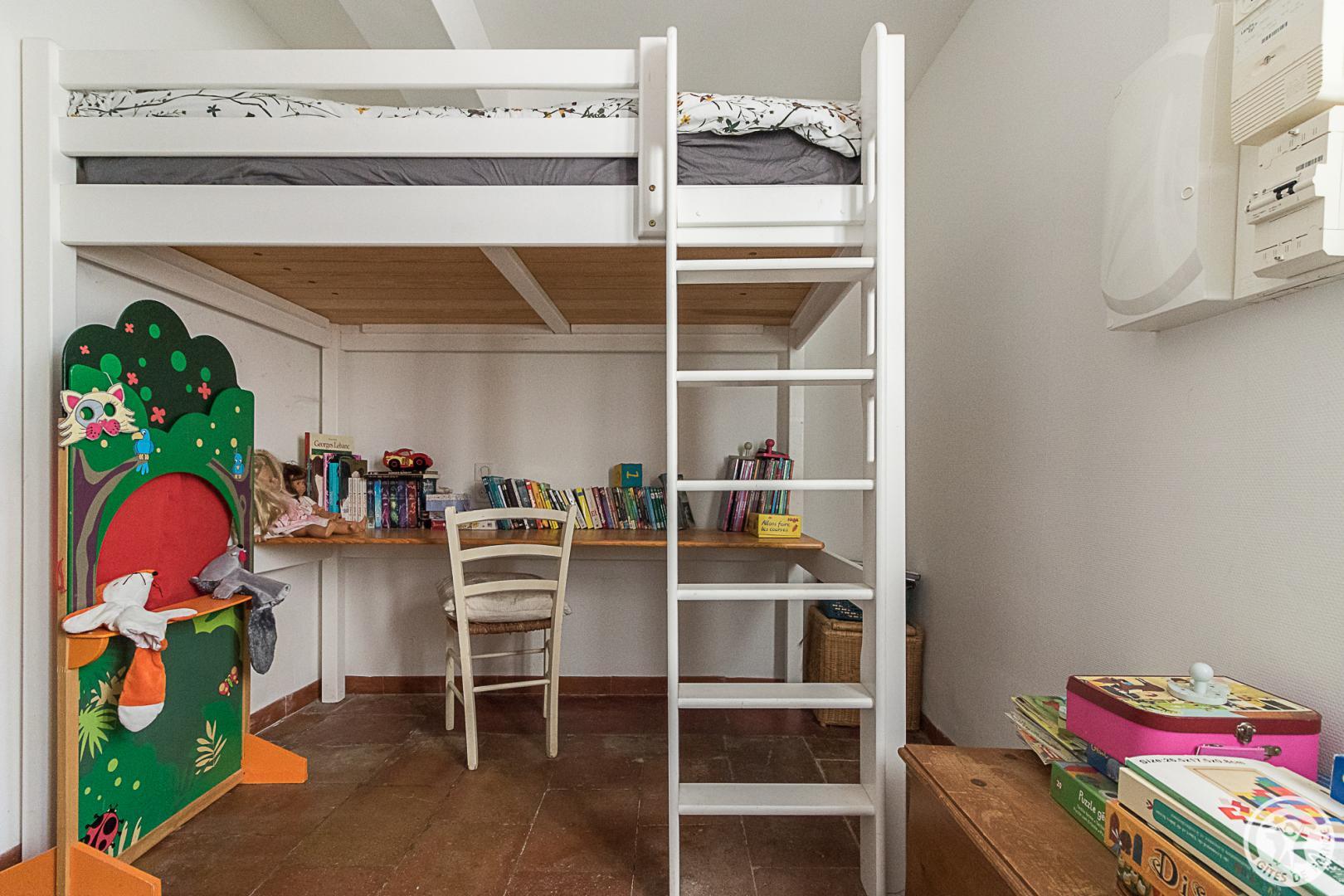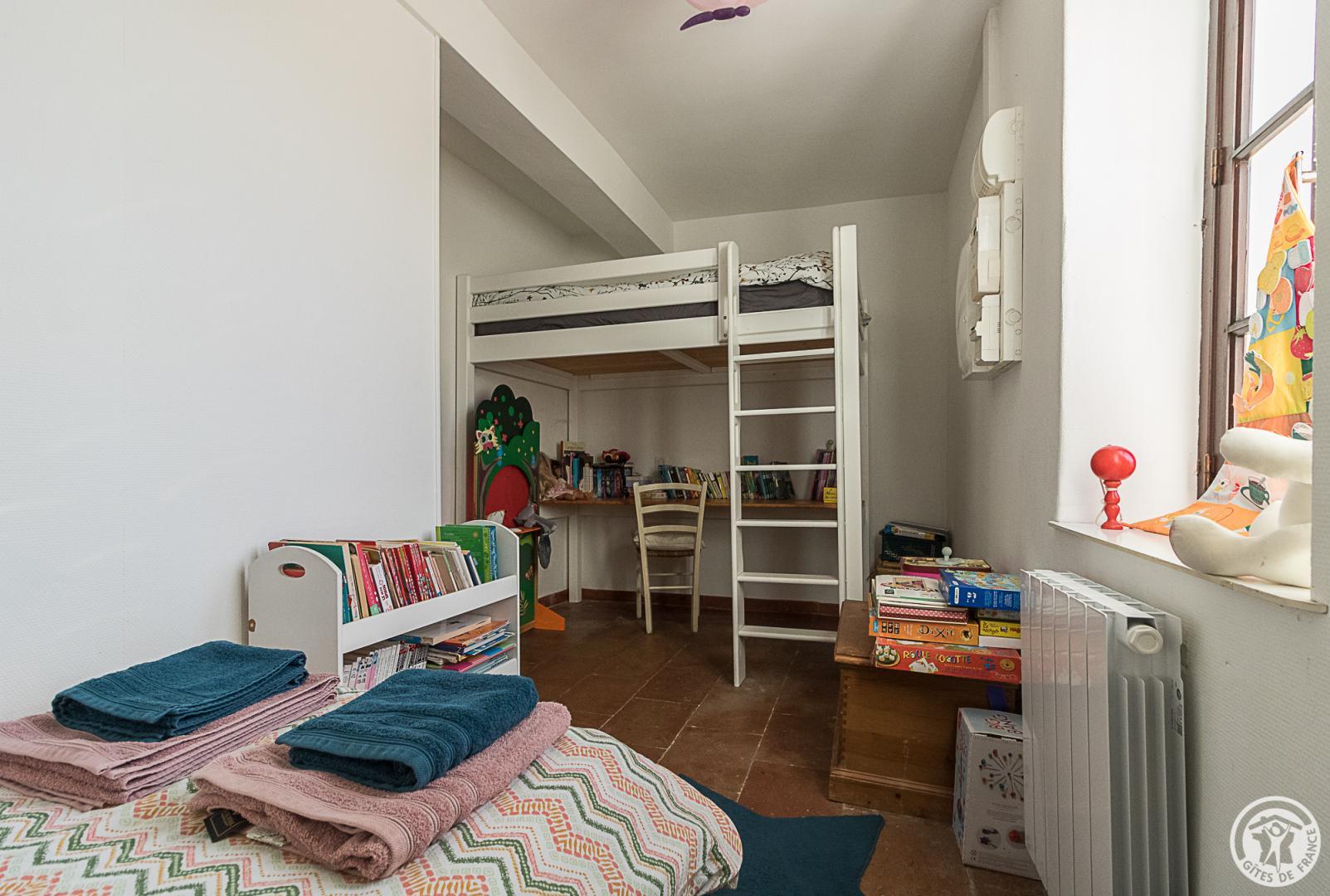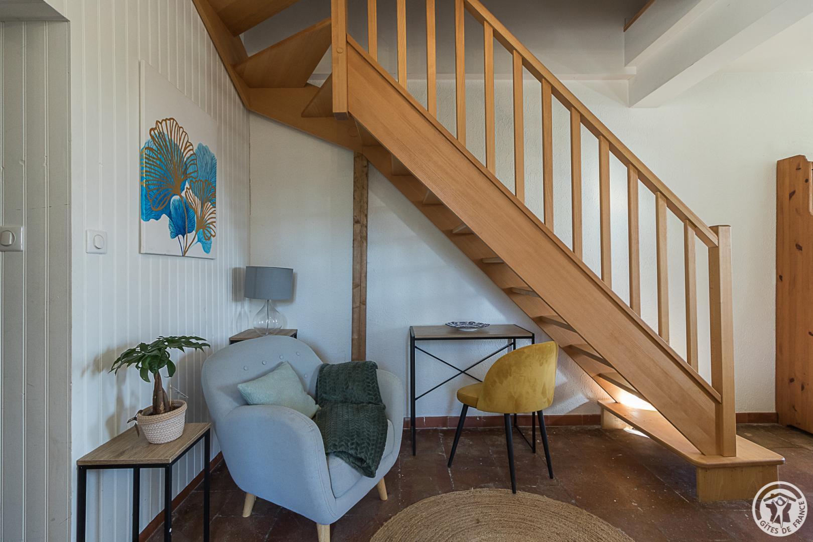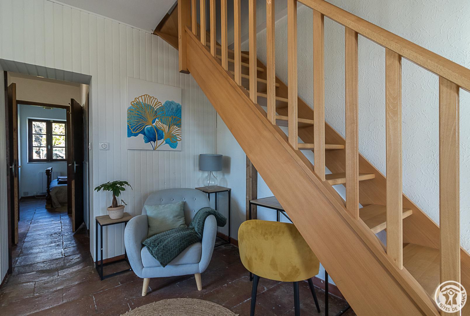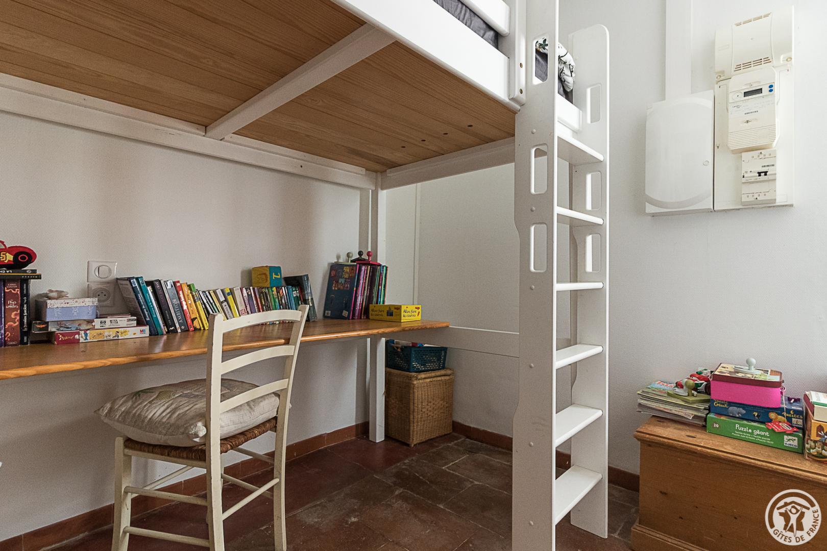 – Au RDC : pièce de séjour comprenant un coin-cuisine séparé de l’espace repas par un bar, petit coin-détente sous l’escalier, jeux de société. Un couloir dessert 2 chambres (1 lit pour 2 personnes en 140x190cm, lit bébé), 1 chambre enfants (1 lit mezzanine pour 1 personne en 120x190cm avec bureau, 1 lit pour 1 personne en 90x190cm), une petite salle de bains et un WC.
