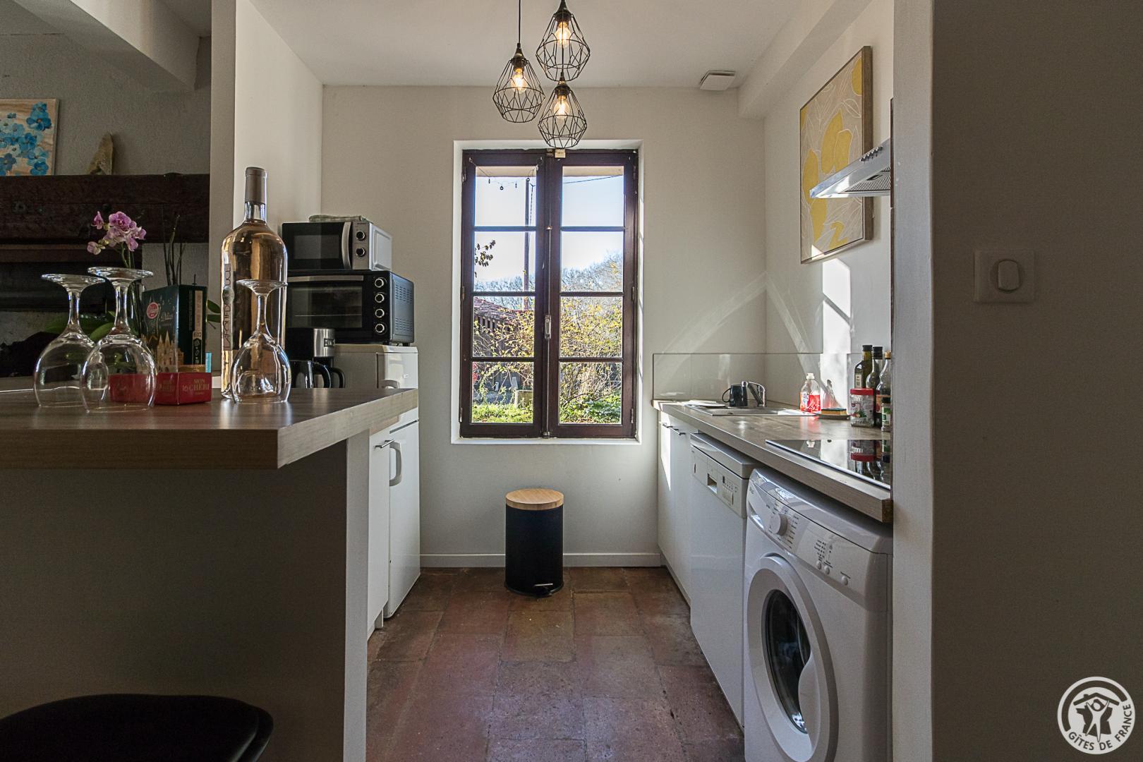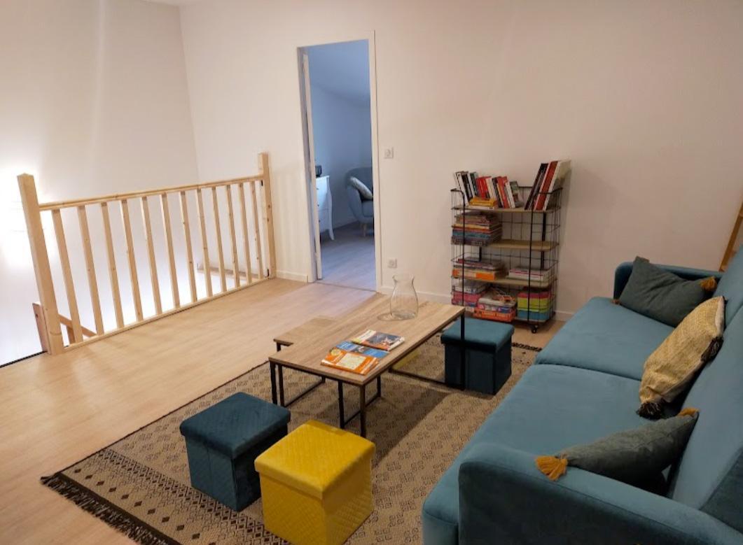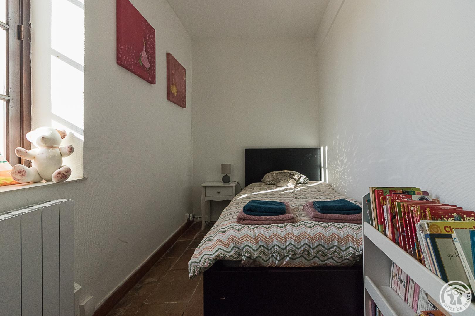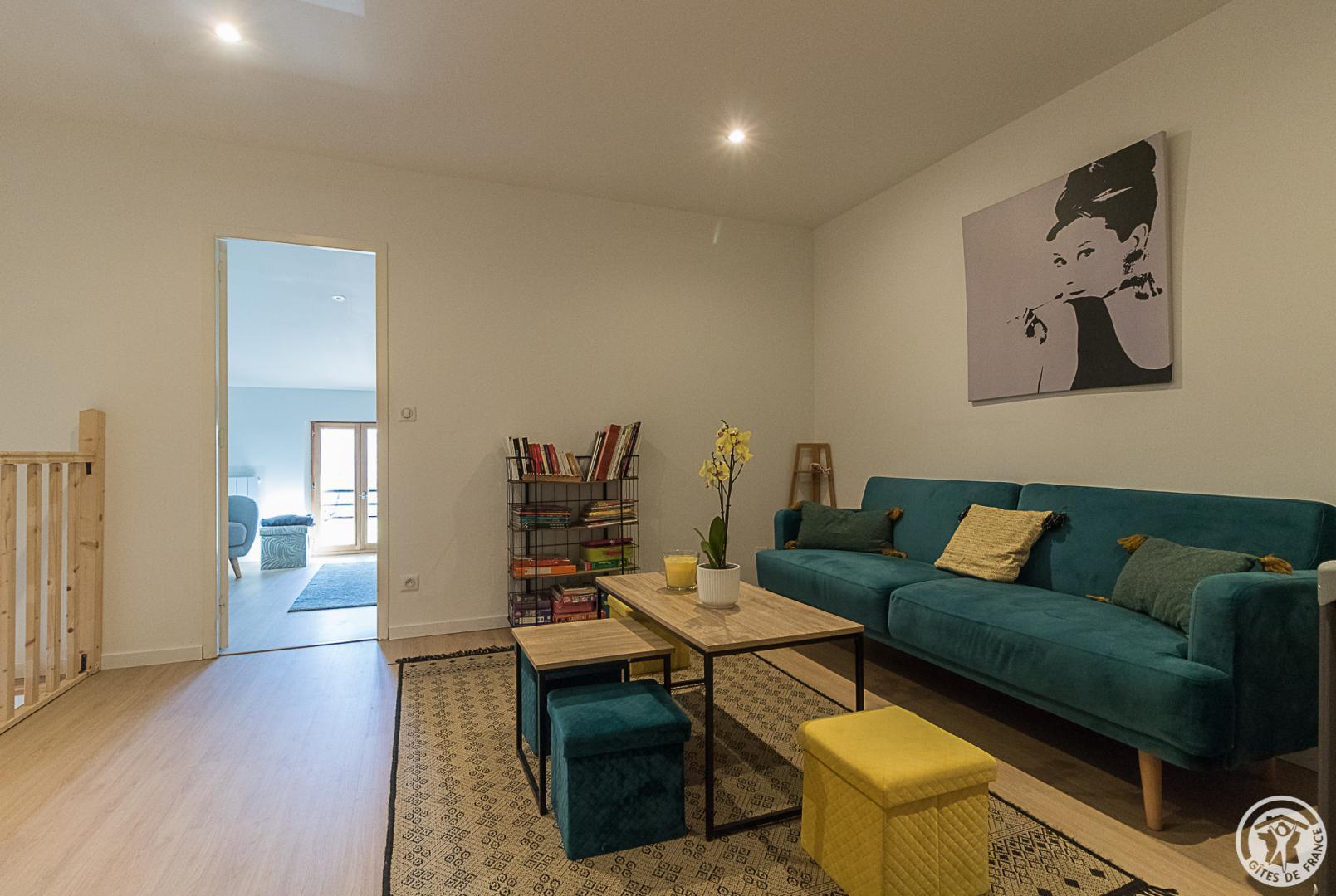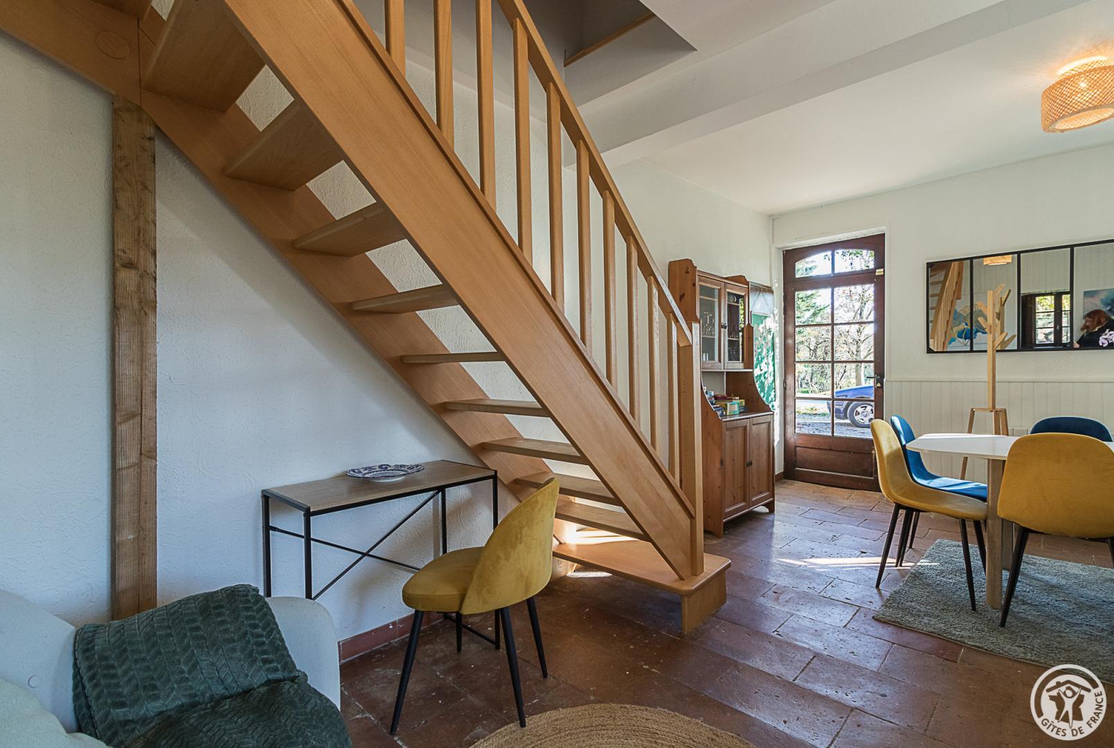 – Au RDC : pièce de séjour comprenant un coin-cuisine séparé de l’espace repas par un bar, petit coin-détente sous l’escalier, jeux de société. Un couloir dessert 2 chambres (1 lit pour 2 personnes en 140x190cm, lit bébé), 1 chambre enfants (1 lit mezzanine pour 1 personne en 120x190cm avec bureau, 1 lit pour 1 personne en 90x190cm), une petite salle de bains et un WC.