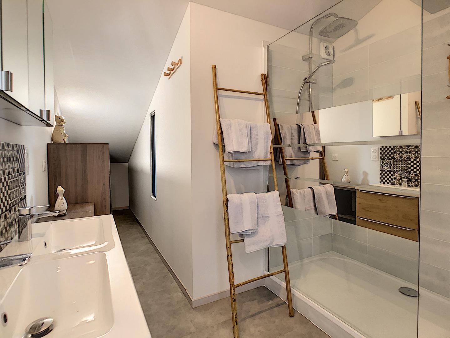 Ce gîte, spacieux et très lumineux, est aménagé sur plusieurs niveaux : l’entrée se fait sur le salon, coin bureau. De là, quelques marches conduisent à la cuisine et à l’espace-repas. WC indépendant avec lave-mains. Un escalier conduit au 1er étage, directement dans la chambre (1 lit pour 2 personnes en 160x200cm). La salle d’eau/dressing est accessible depuis la chambre par 3 marches. Chauffage électrique. Connexion internet Wifi (fibre). Gîte non fumeurs.