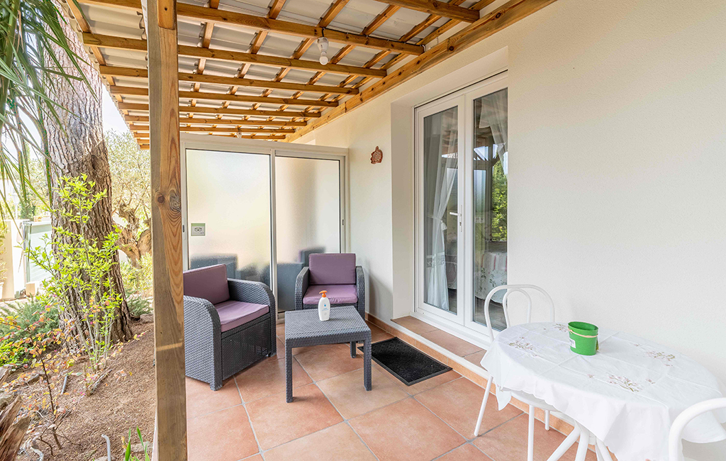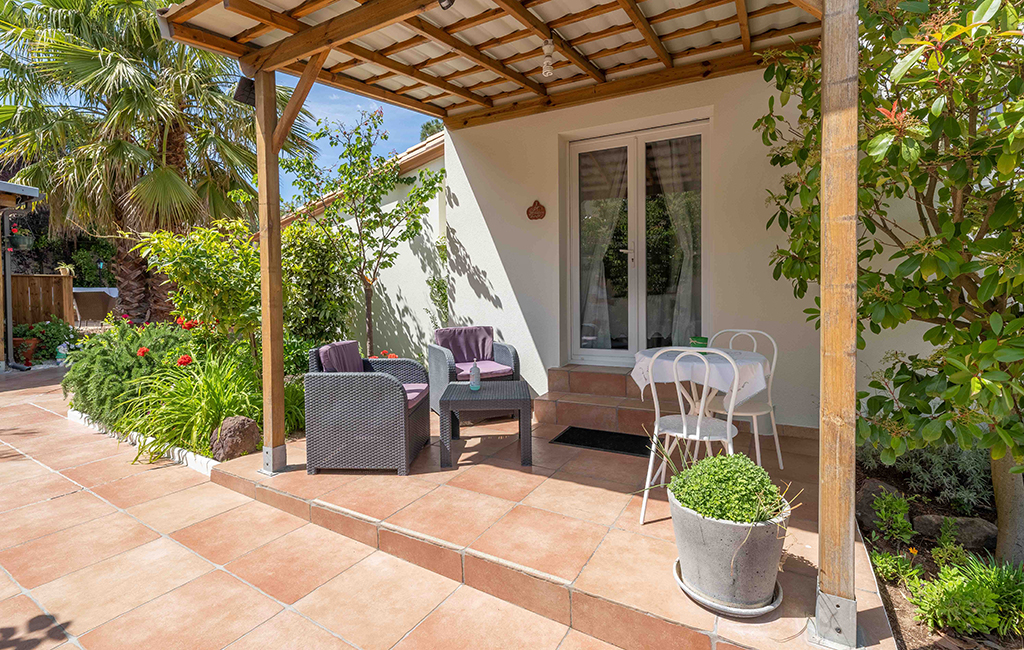 Petit-déjeuner continental (sucré et salé) servi sous le patio commun ou sur terrasse individuelle.